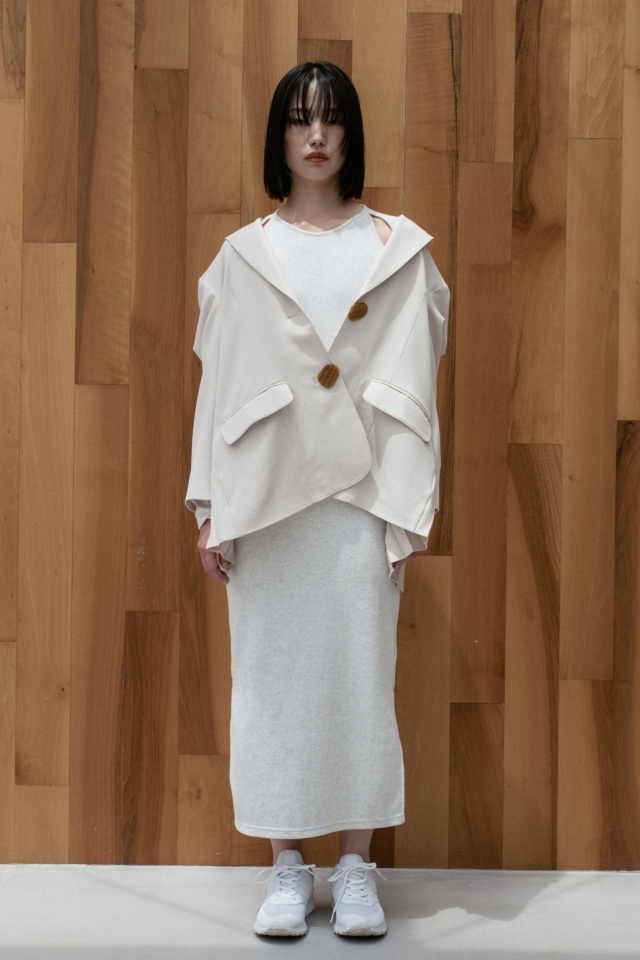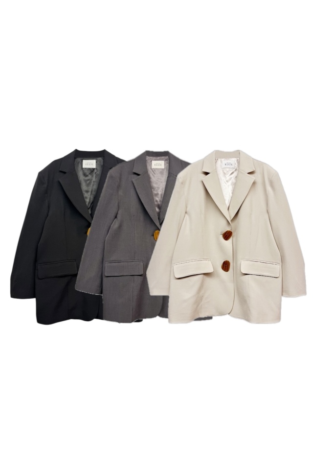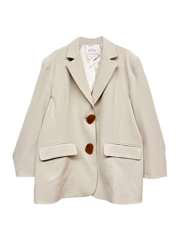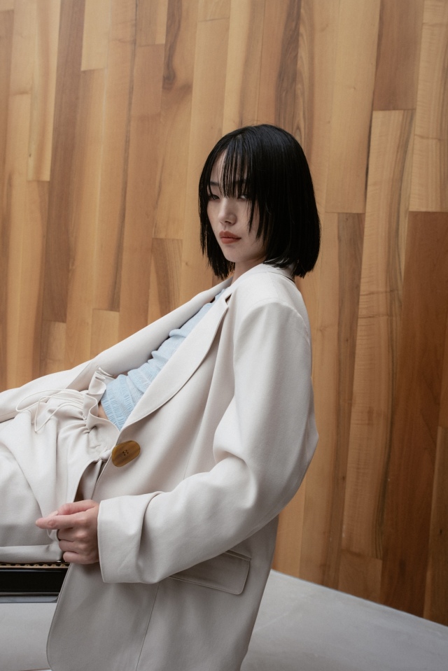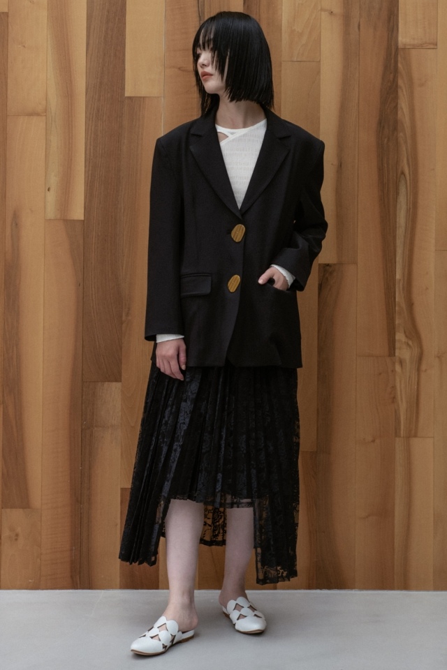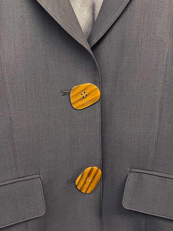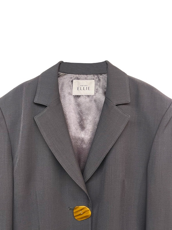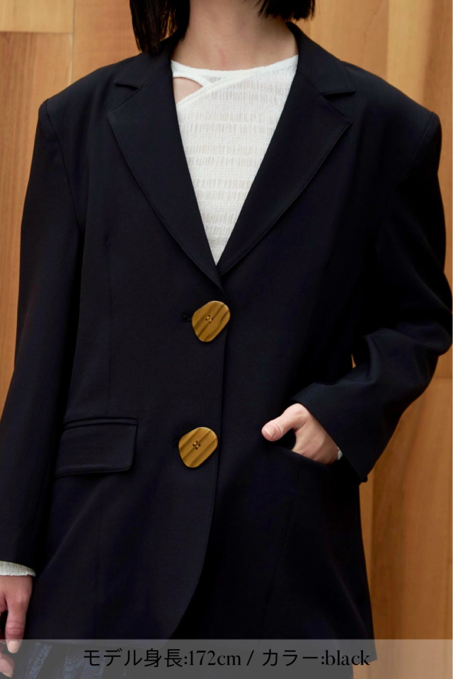 肩を強調したシルエットやボタンなどの細部にもこだわり抜いた一枚です。