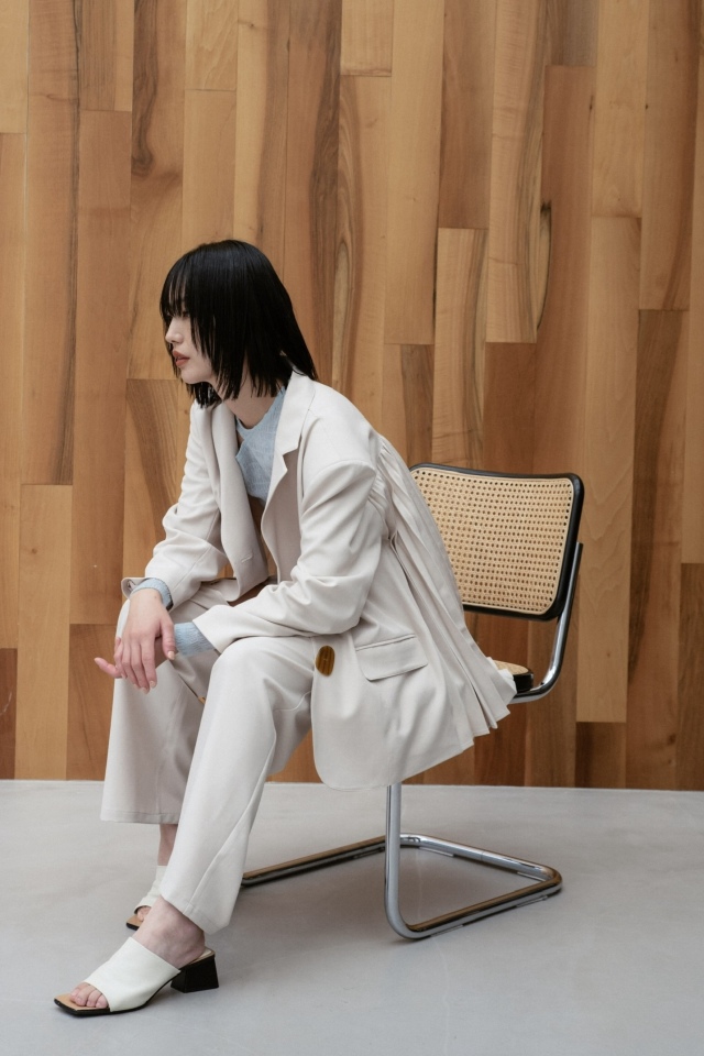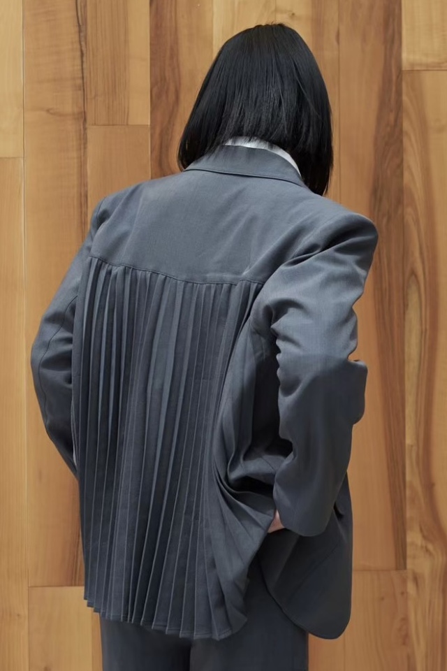 後ろには細やかなプリーツを施しエッジの効いた個性的なデザインに。