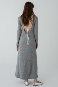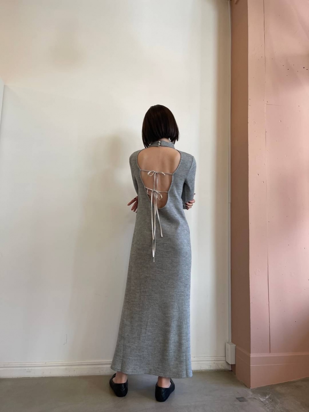 フロントのシンプルなデザインに対し、バックの大胆な開きがギャップのロングワンピース。