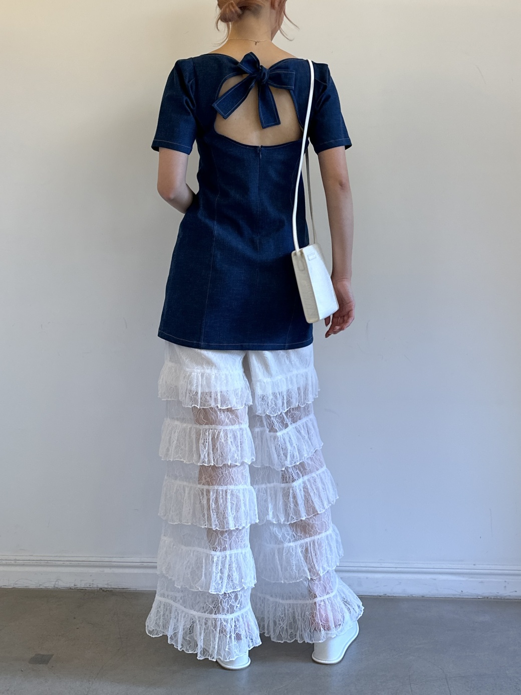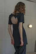 フロントはデコルテが美しく見えるスクエア、バックはサークルにカットアウトしリボンで結べる仕様にして、カジュアルながら甘さを引き立てました。