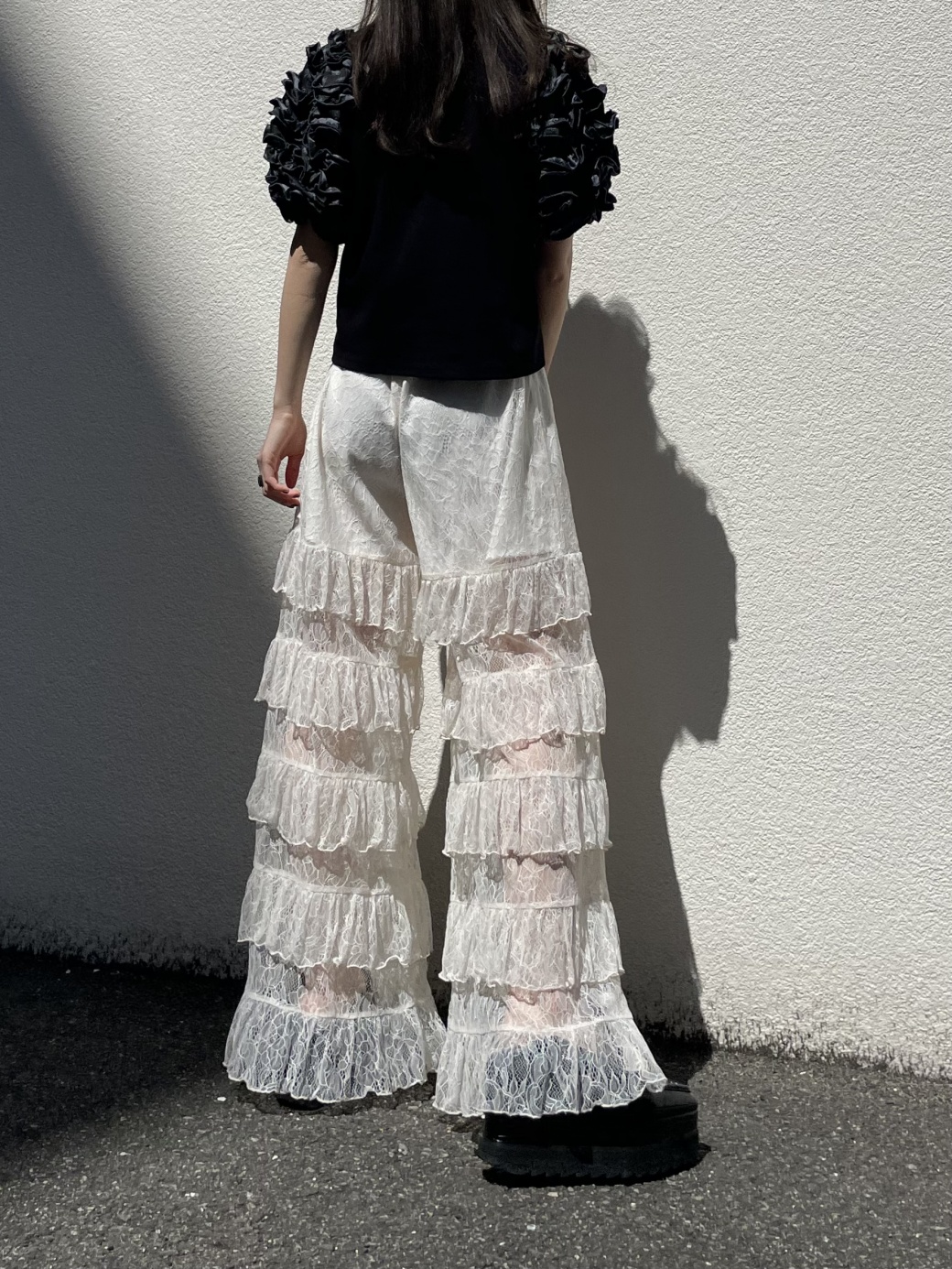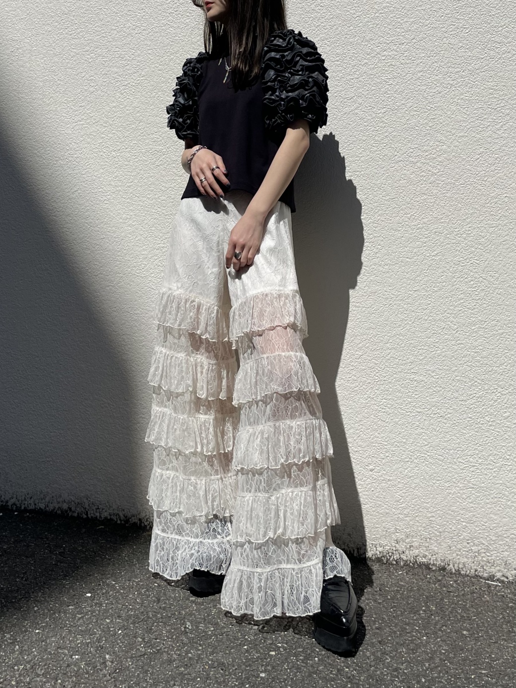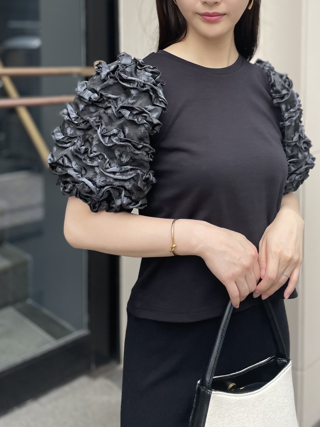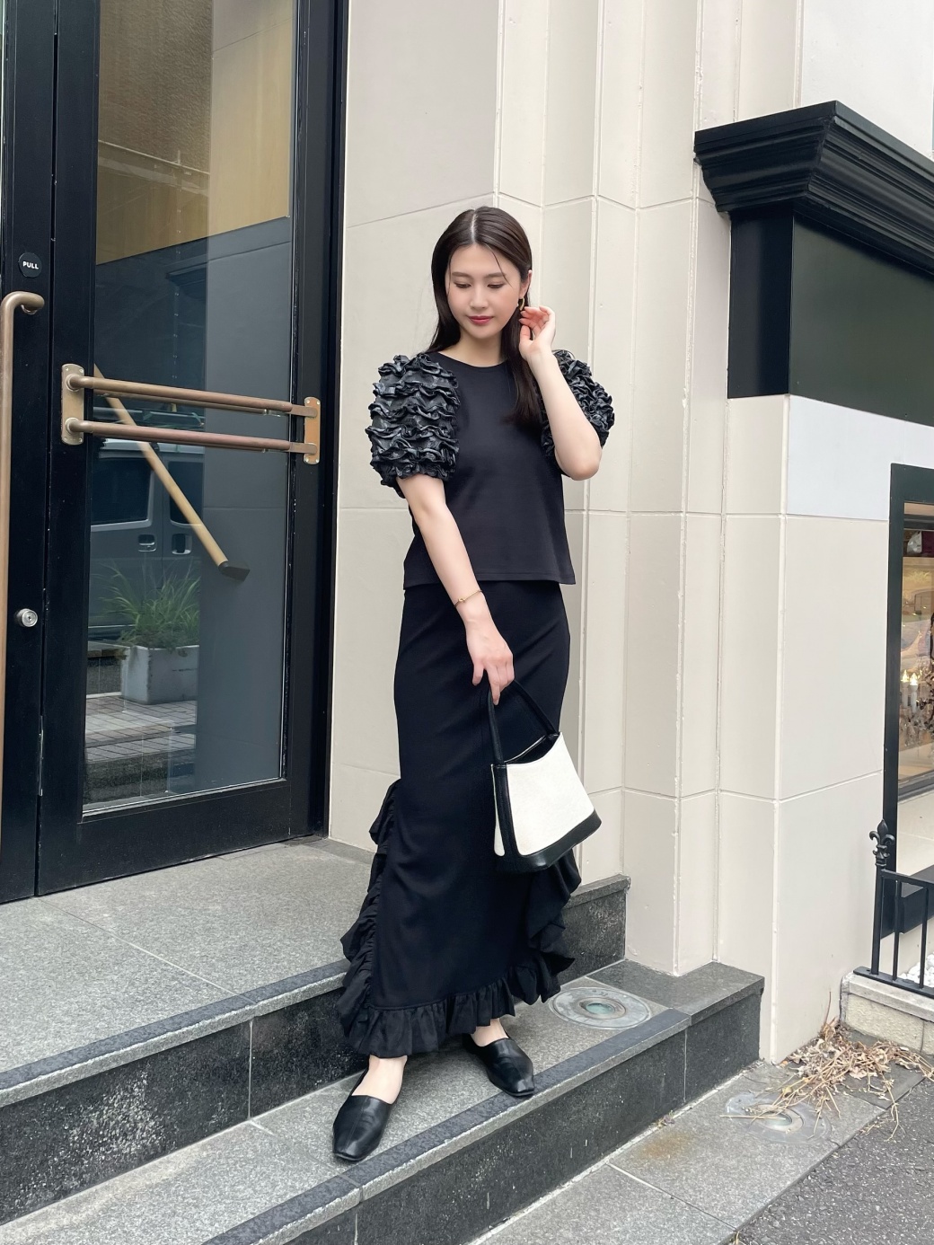 ハリのあるフラワー柄タフタでふんだんにフリルを施し、華やかなボリュームを表現。