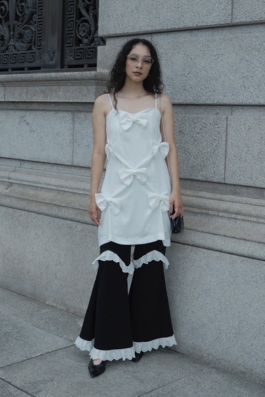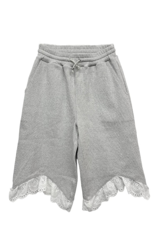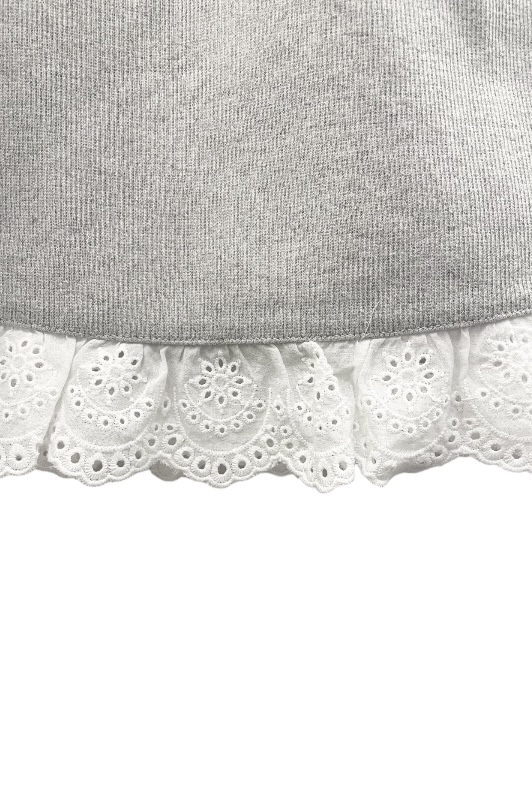 ・カジュアル素材にホワイトのコットンレースフリルをプラス