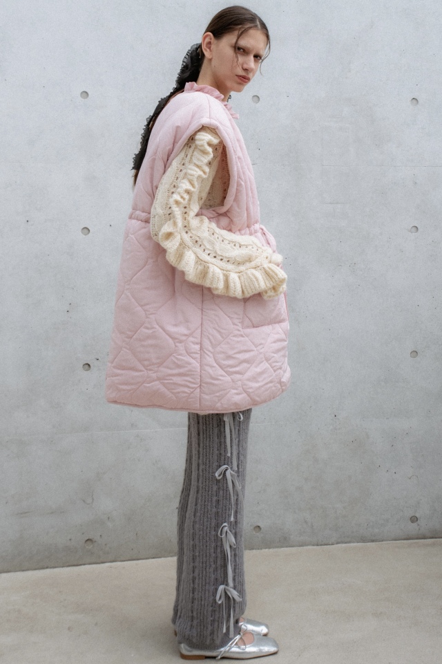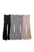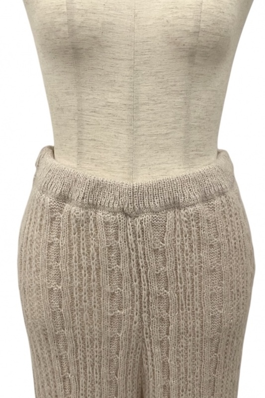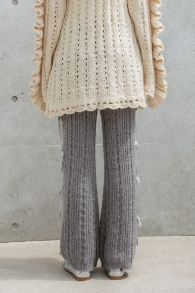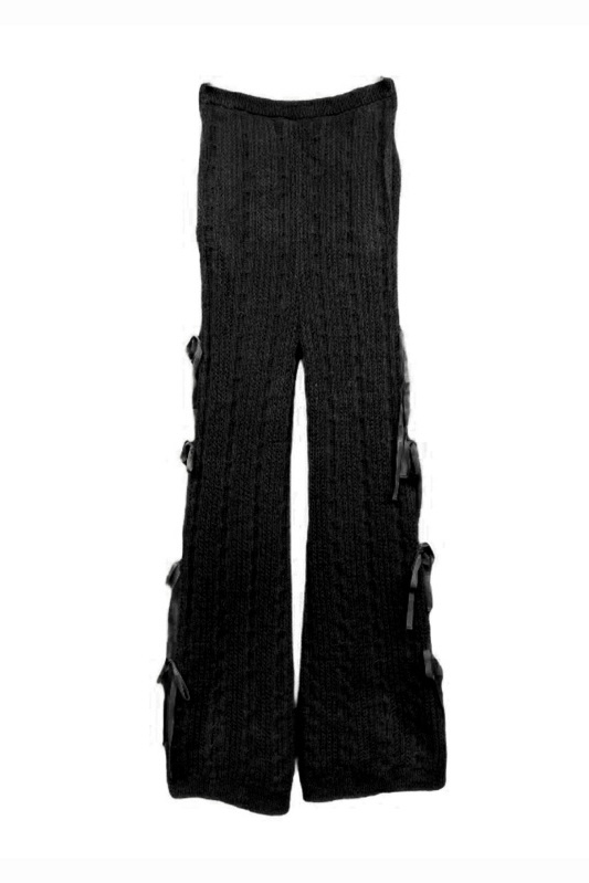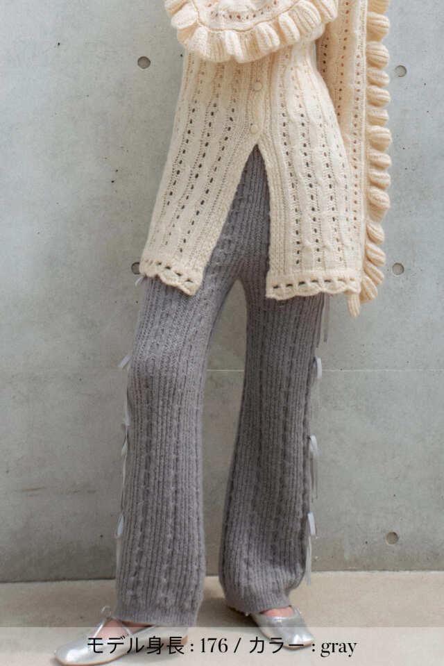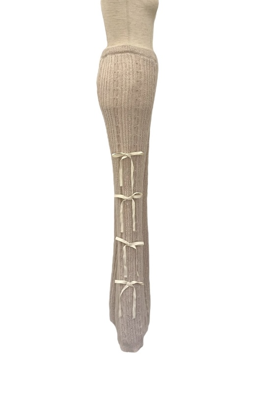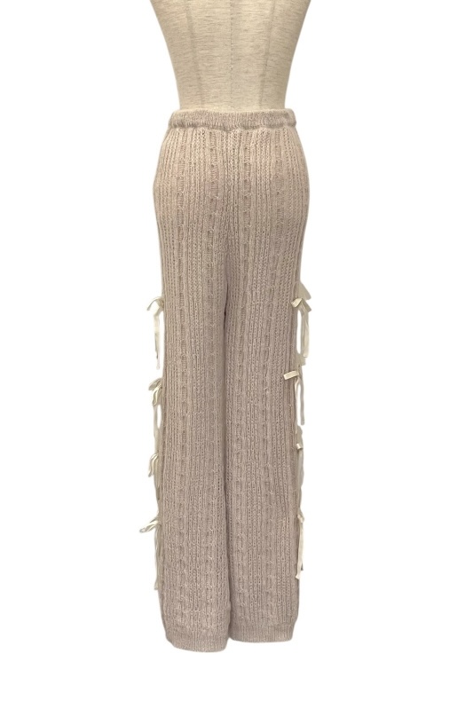 パンツの両サイドに細めのリボンが連なるニットパンツ。