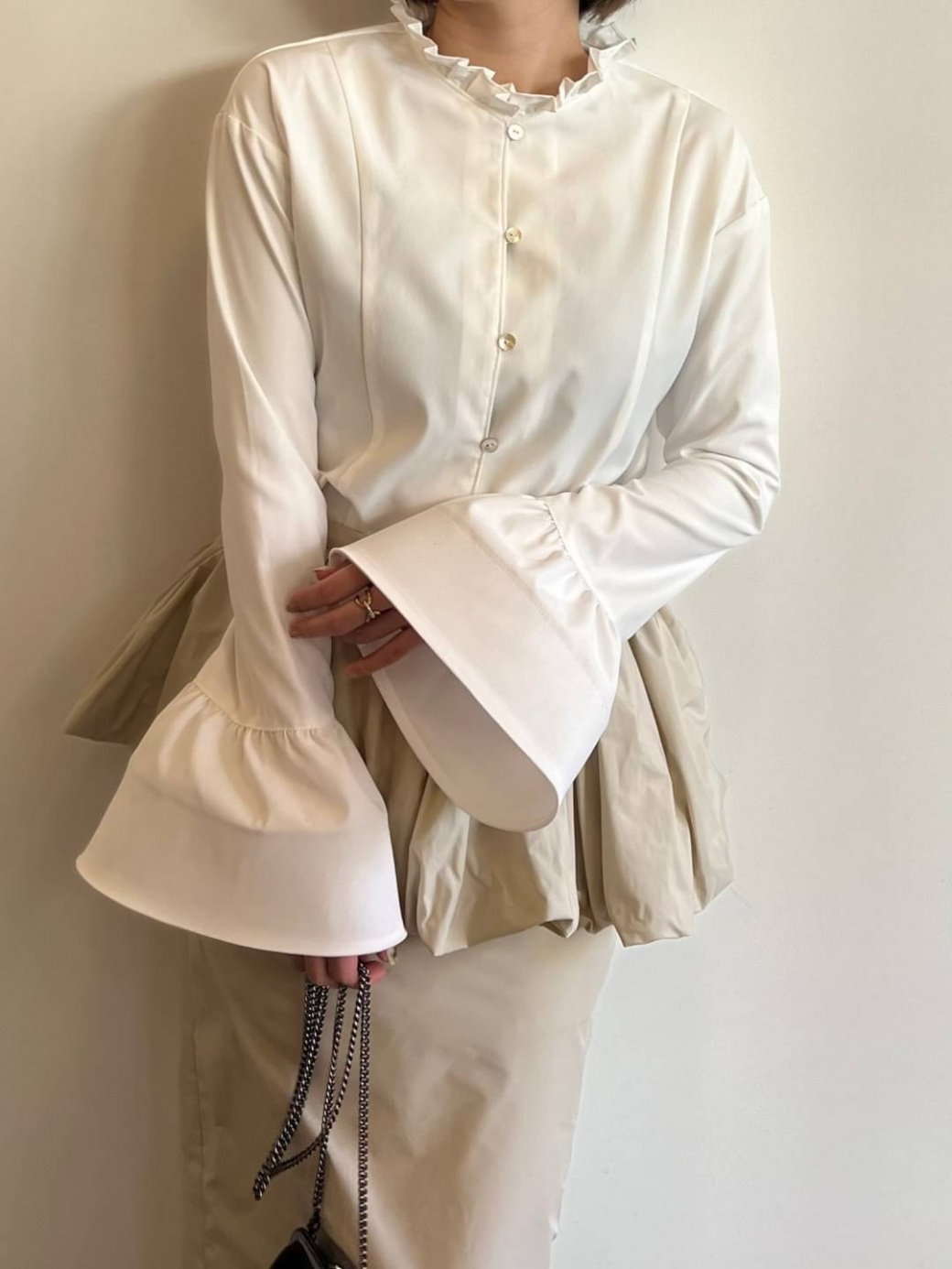 袖のベルスリーブとAラインに広がる裾が細見えを叶えます。