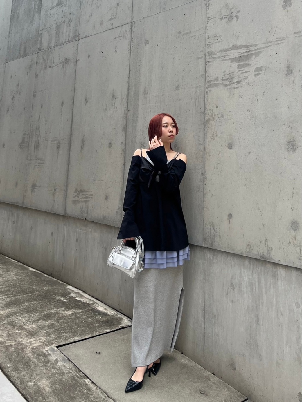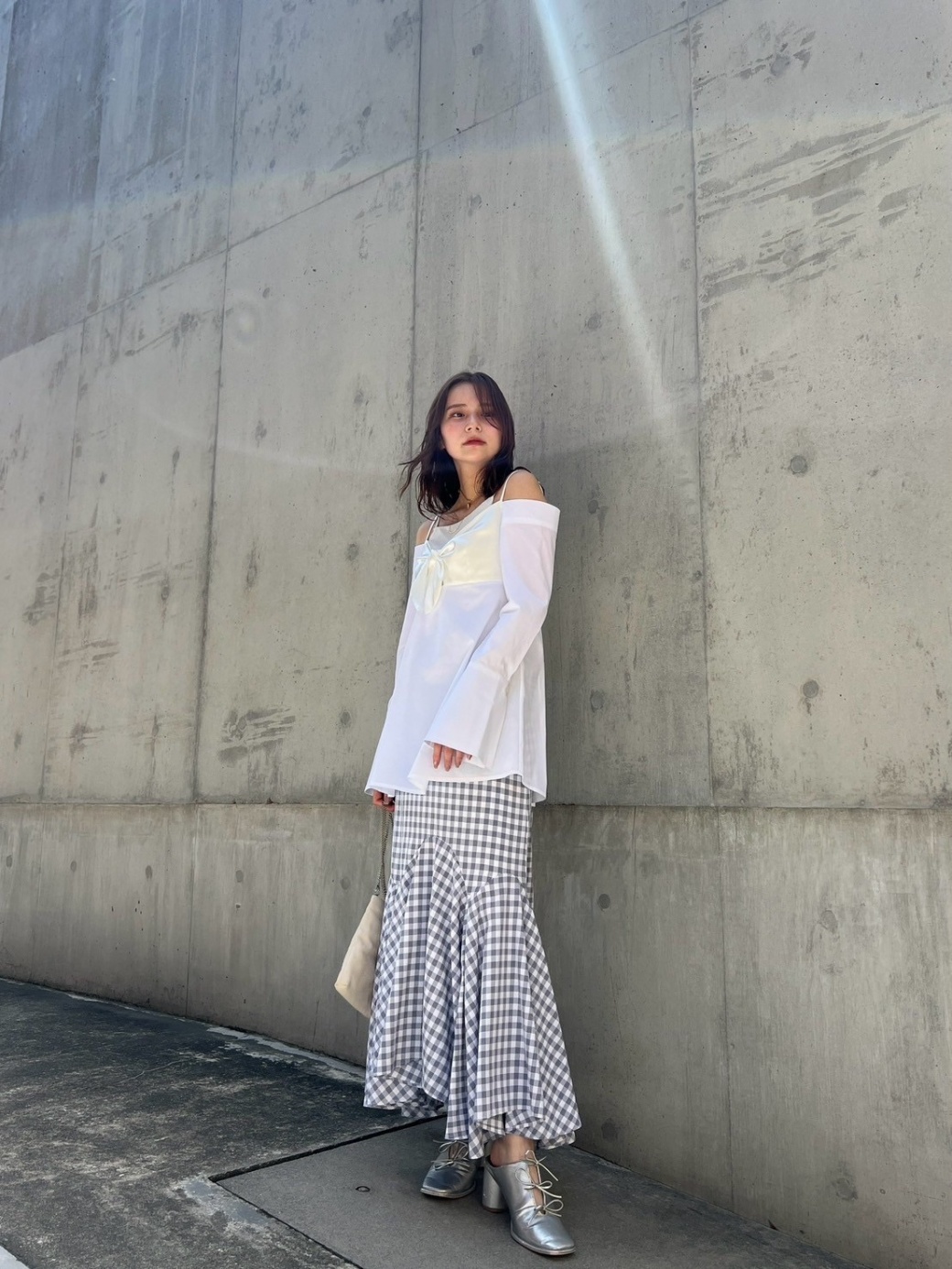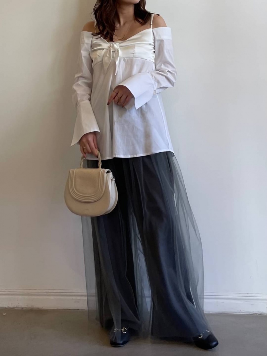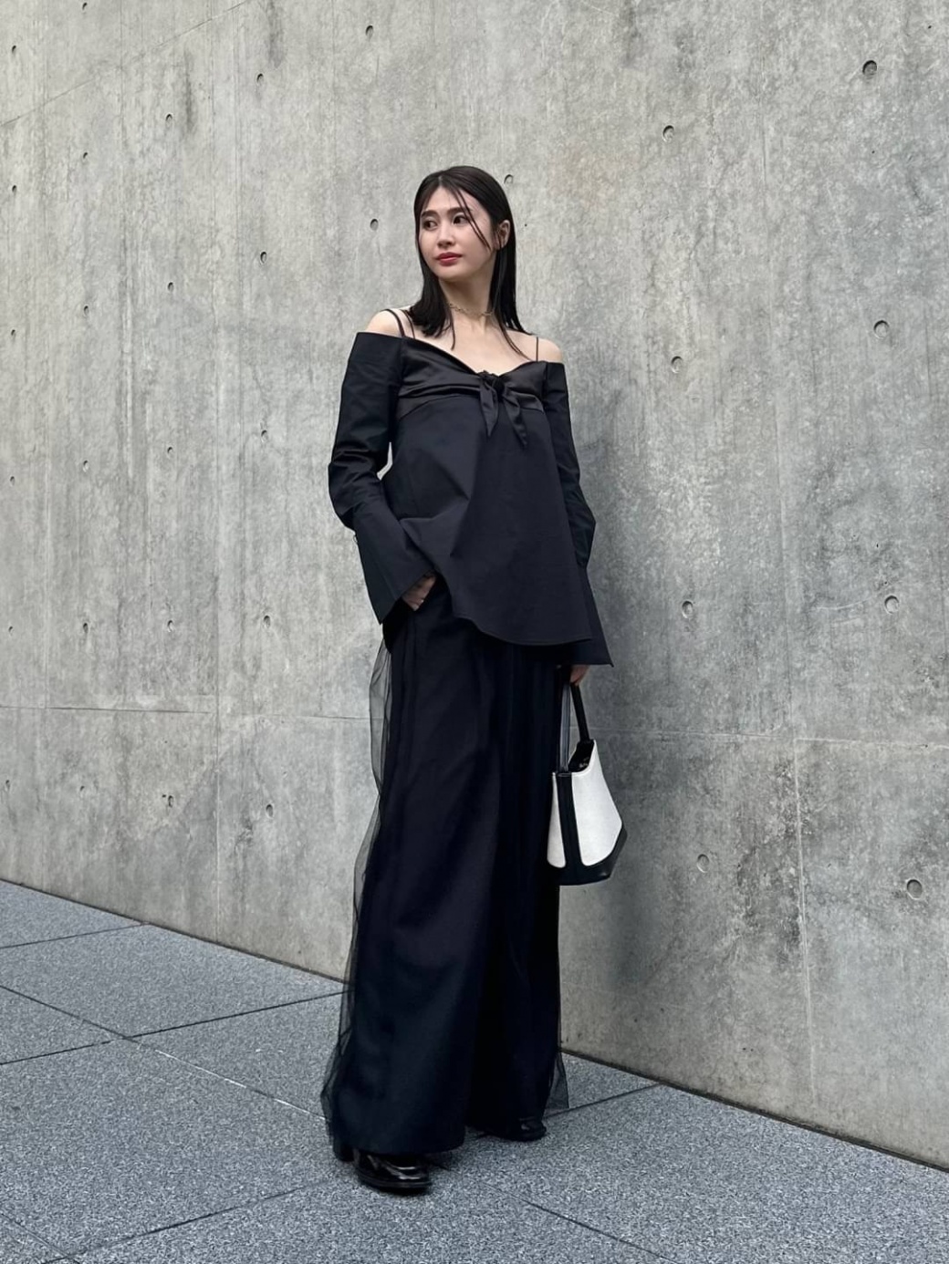 デコルテを全て出すのに抵抗がある方はインナーに薄手のトップスをレイヤードしても◎