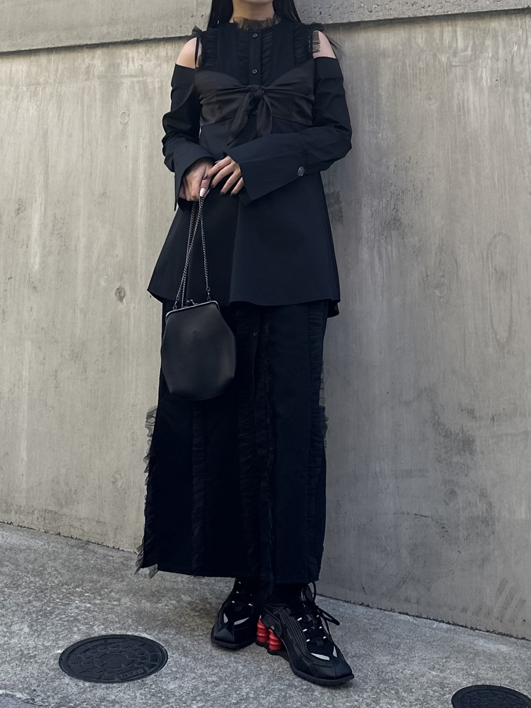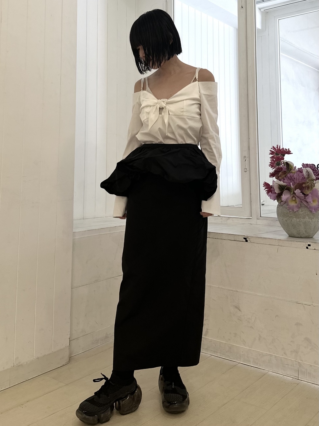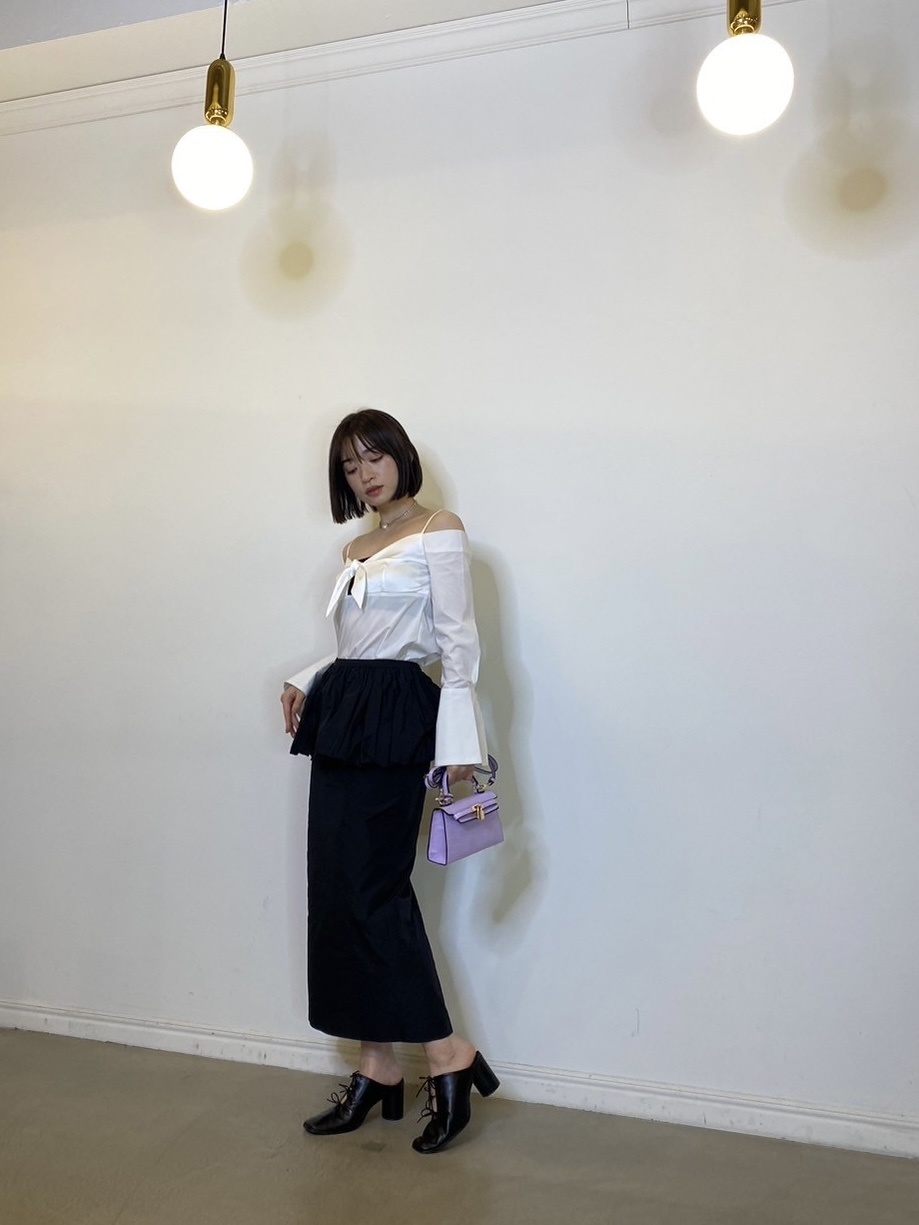 サテン素材とコットン素材をドッキングさせた異素材ブラウスは、 オフショルダーのヘルシーな露出が抜け感と女性らしさを演出します。