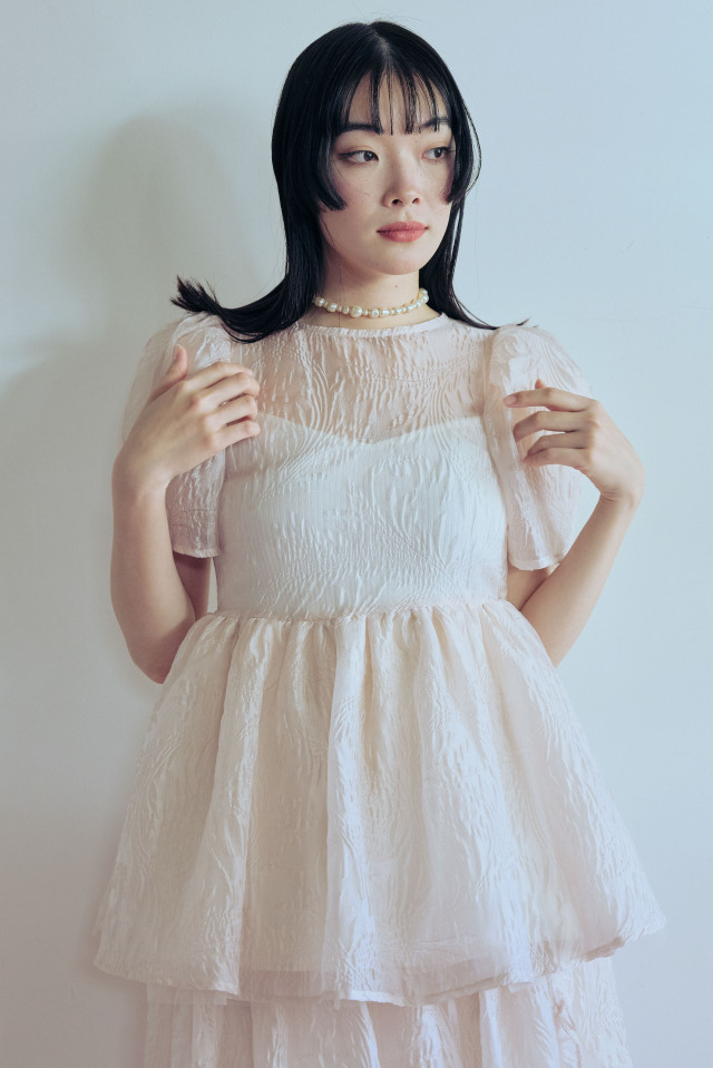 同素材 jacquard organdie frill skirt( 24S-DR-12) と合わせて、ドレスのような特別感のあるセットアップスタイルに