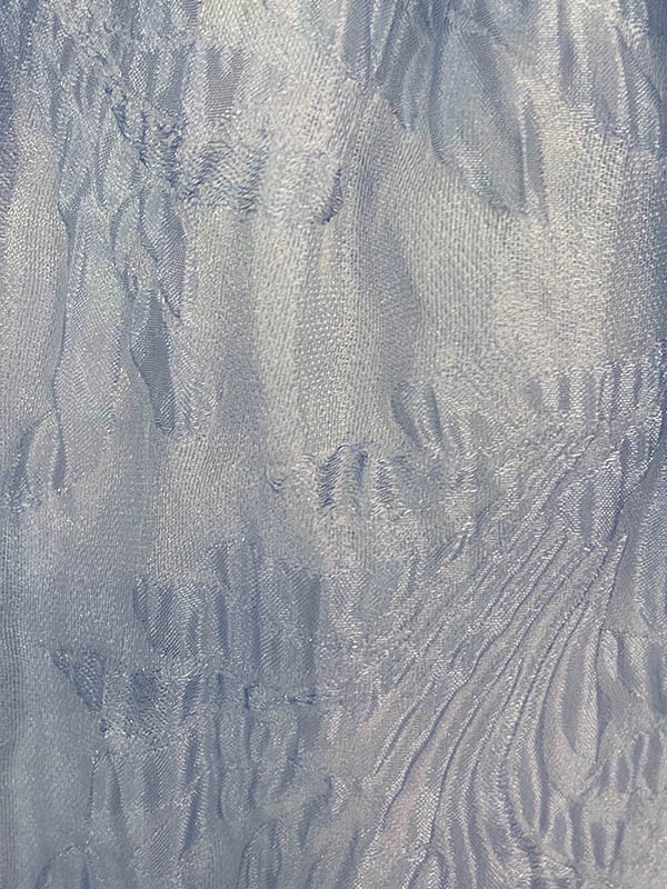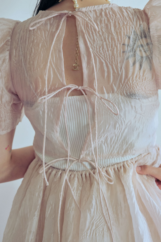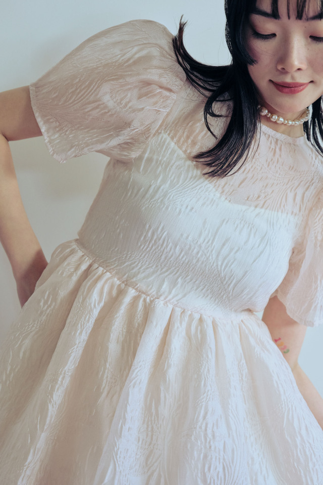 軽やかなオーガンジー素材がふんわりと広がり、印象的なシルエットを描きます。