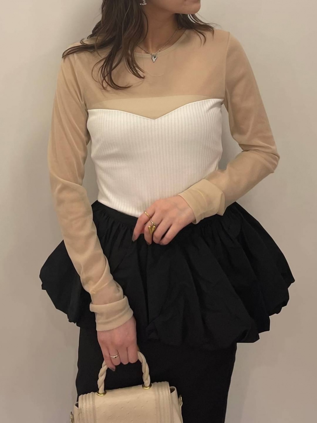 ビスチェとトップスがドッキングした異素材感がおしゃれなトップス。