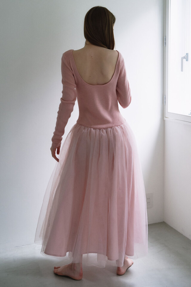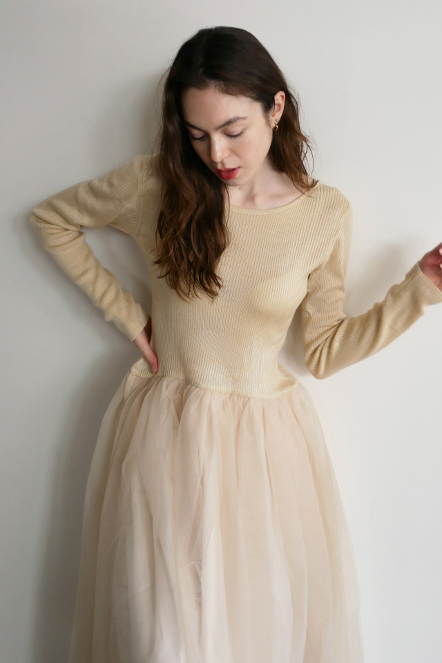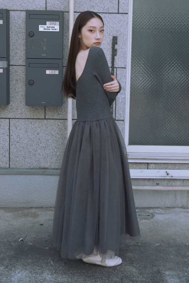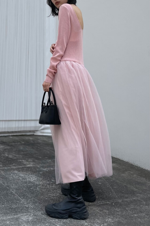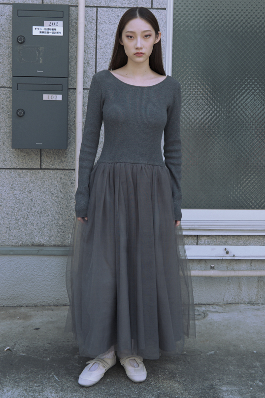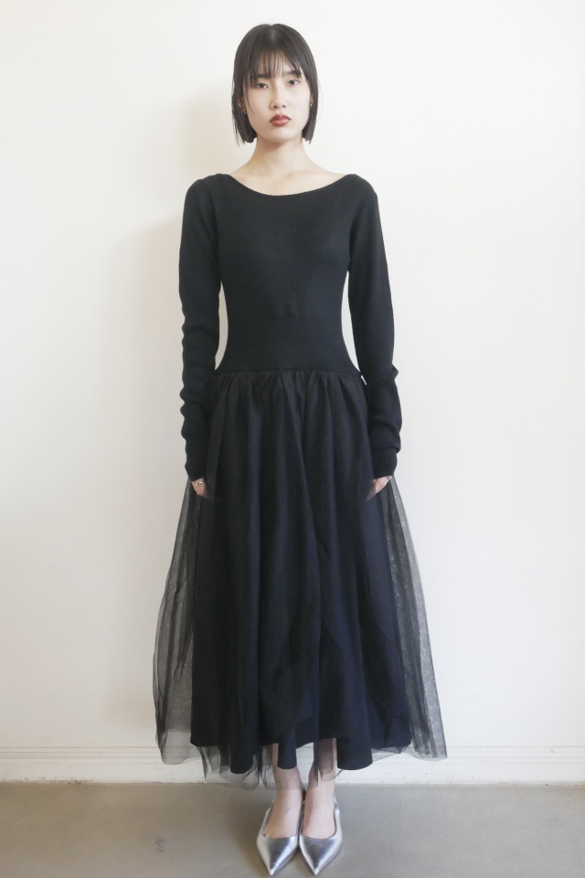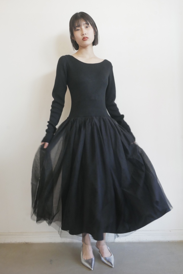 チュールの甘さをさらっと着こなす、異素材ドッキングワンピース