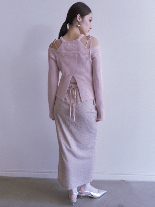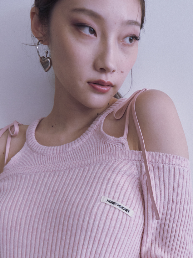 ・同素材のHONEY logo off shoulder rib knit tops(25A1-DR-TP05)とアンサンブルでの着用でよりこなれた印象に