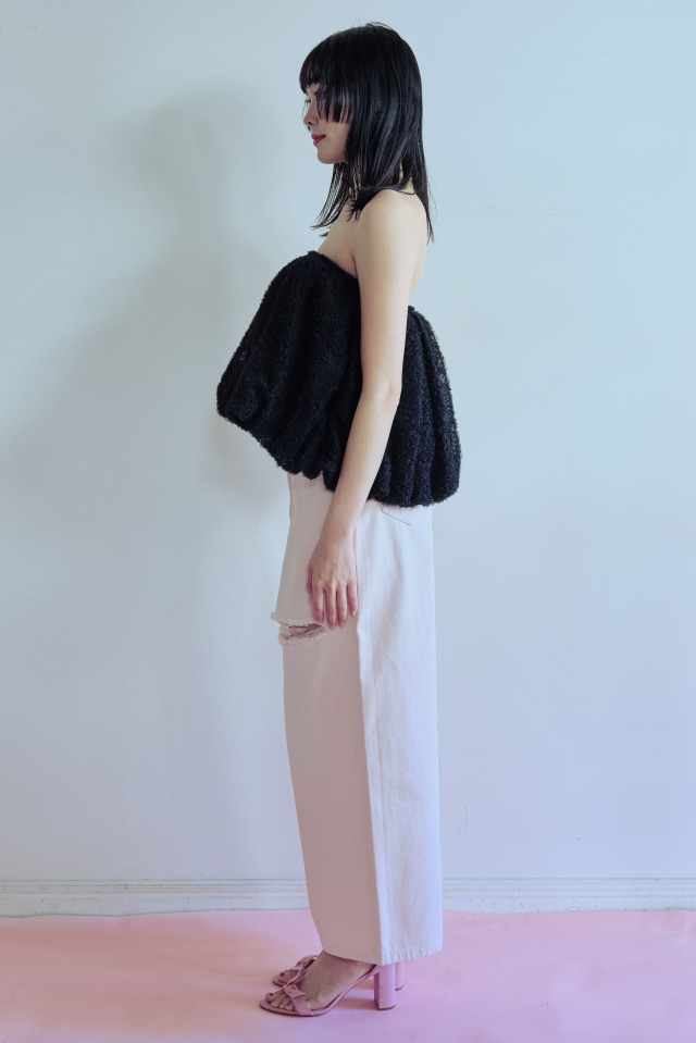 コンパクトなトップスを合わせたメリハリのあるスタイリングはもちろん、