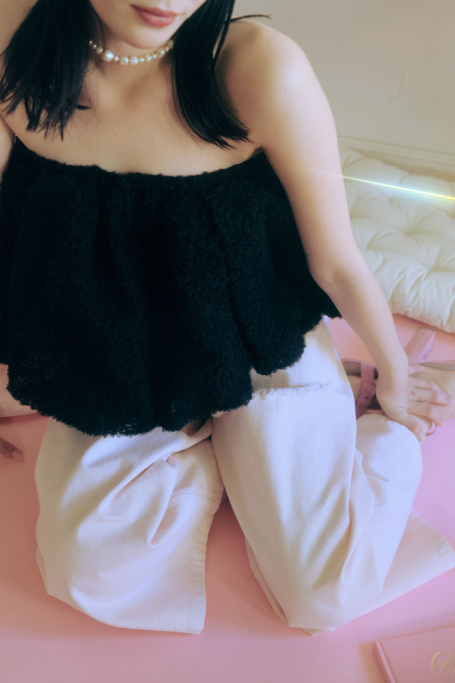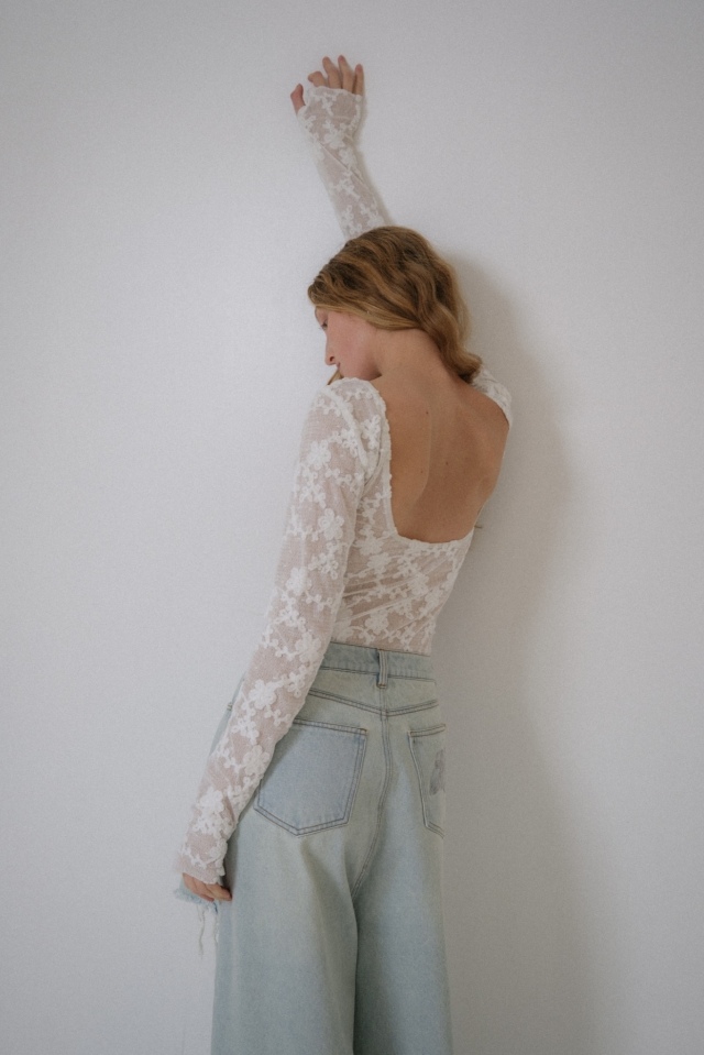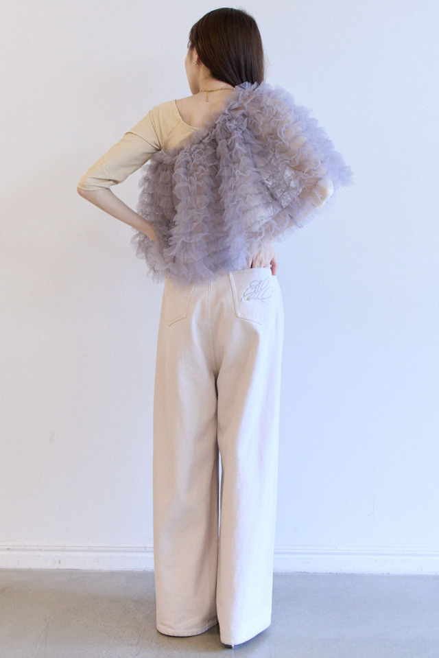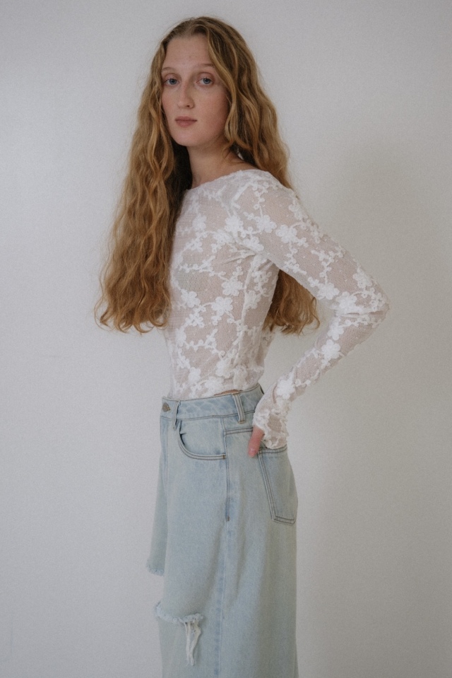 レースやシアー素材のトップスと組み合わせたフェミニンミックスもおすすめ。