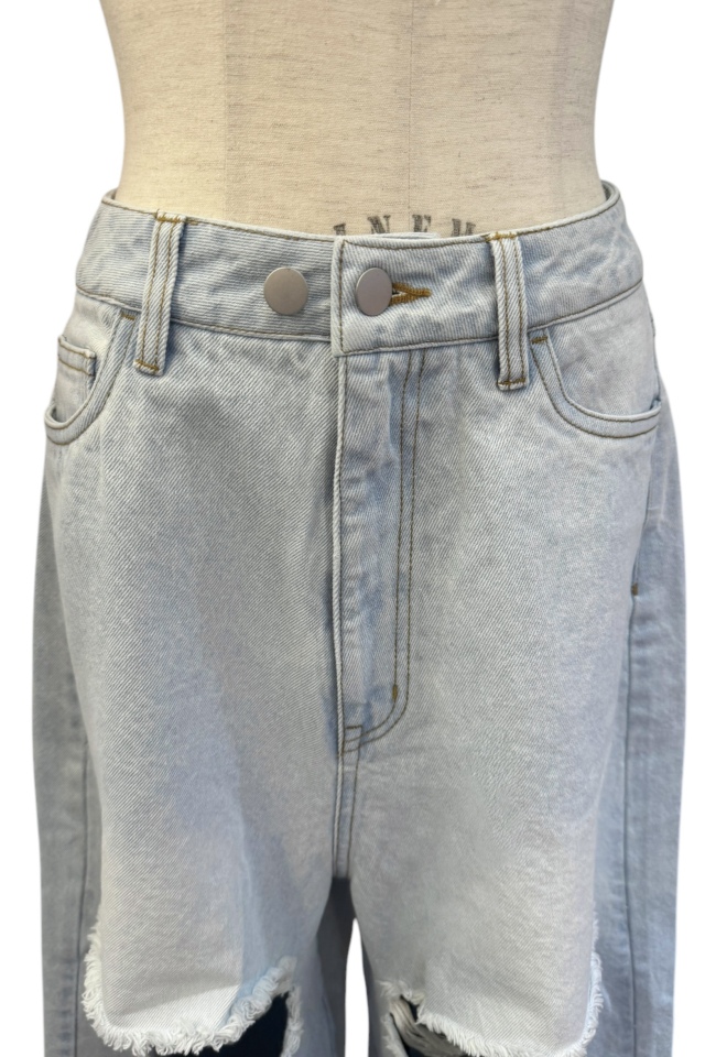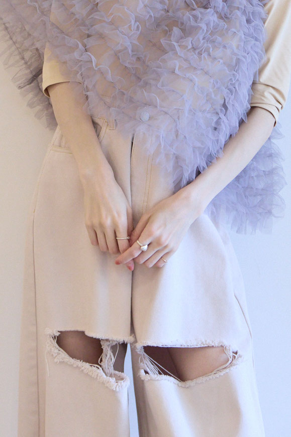 ラフな雰囲気の中にエッジを効かせたダメージ加工が、抜け感のあるスタイリングを演出。
