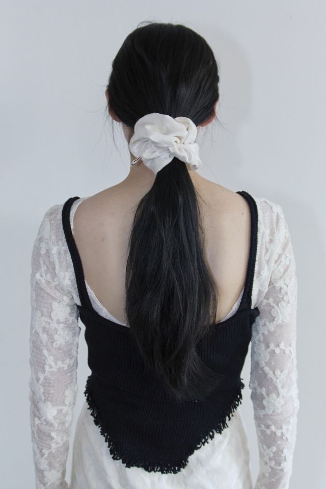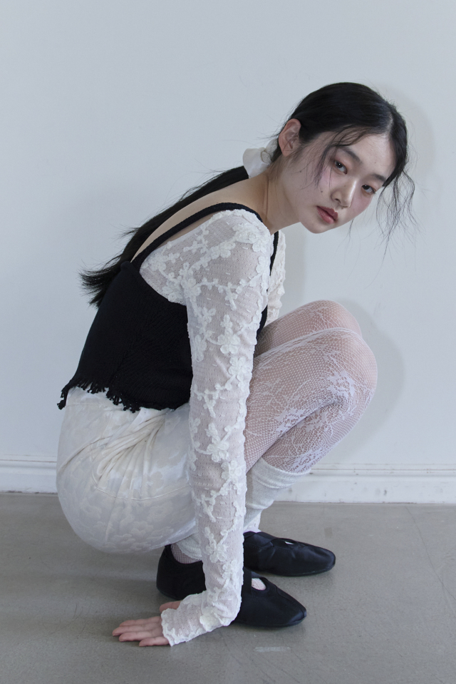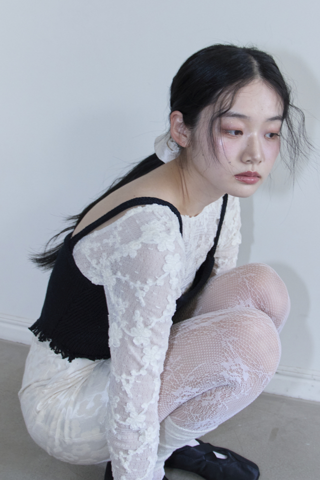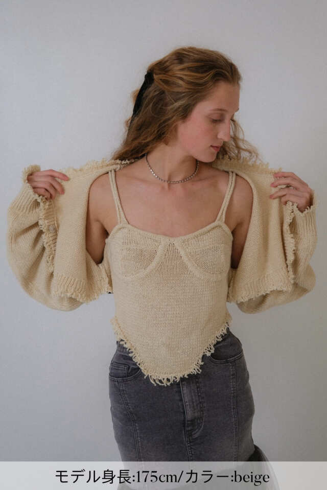 同素材のcropped ribbon cardigan(25S-DR-TP06)を上から羽織り