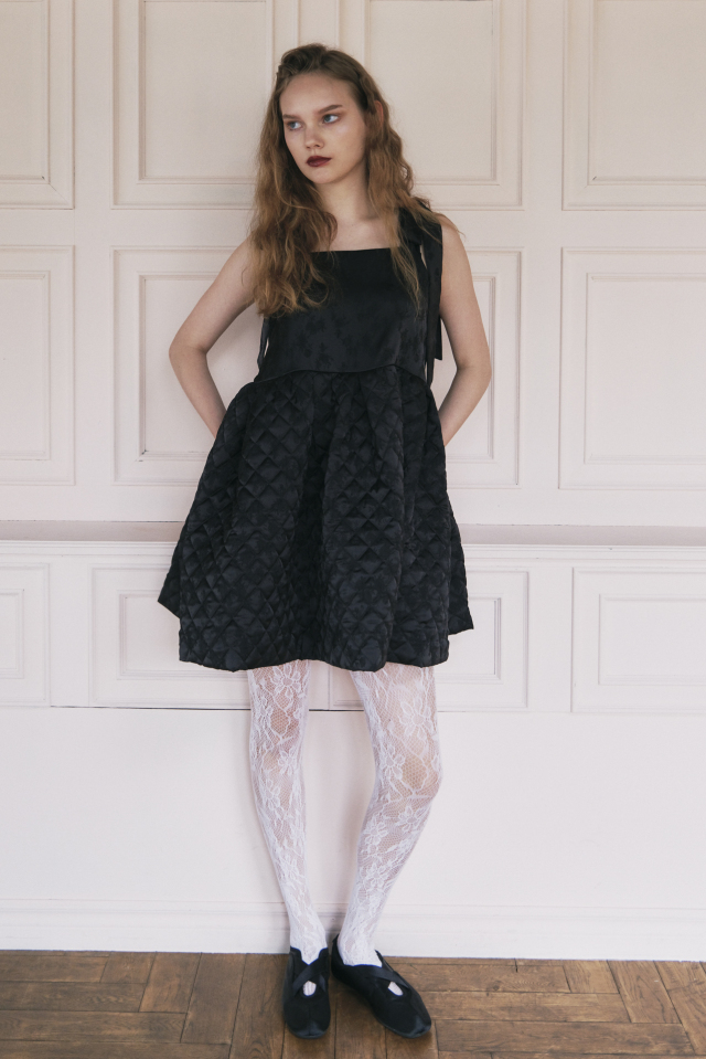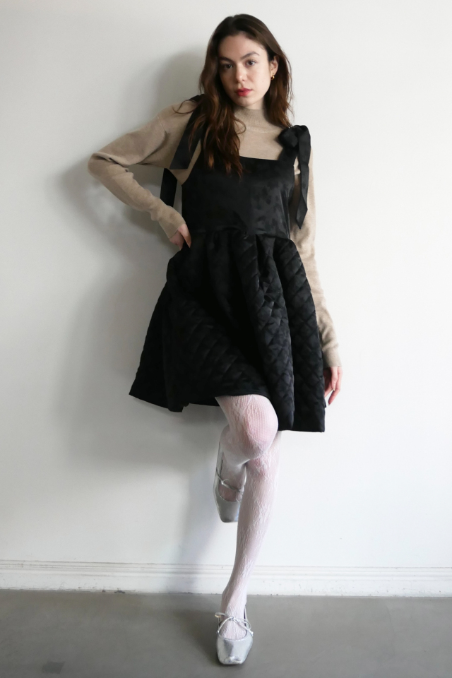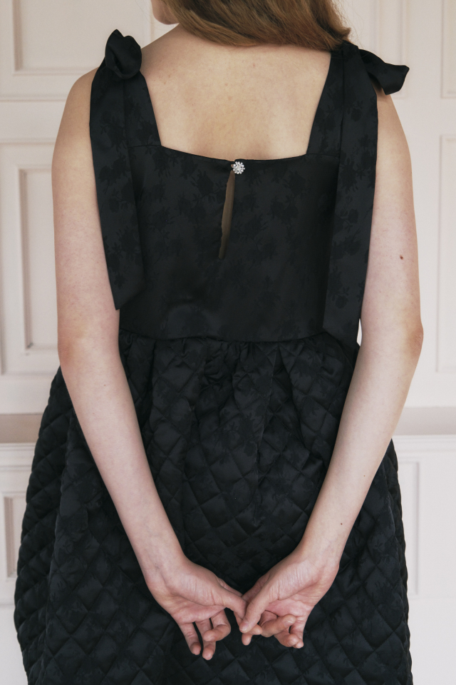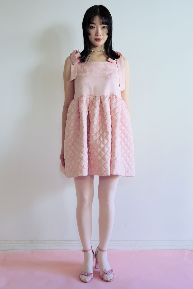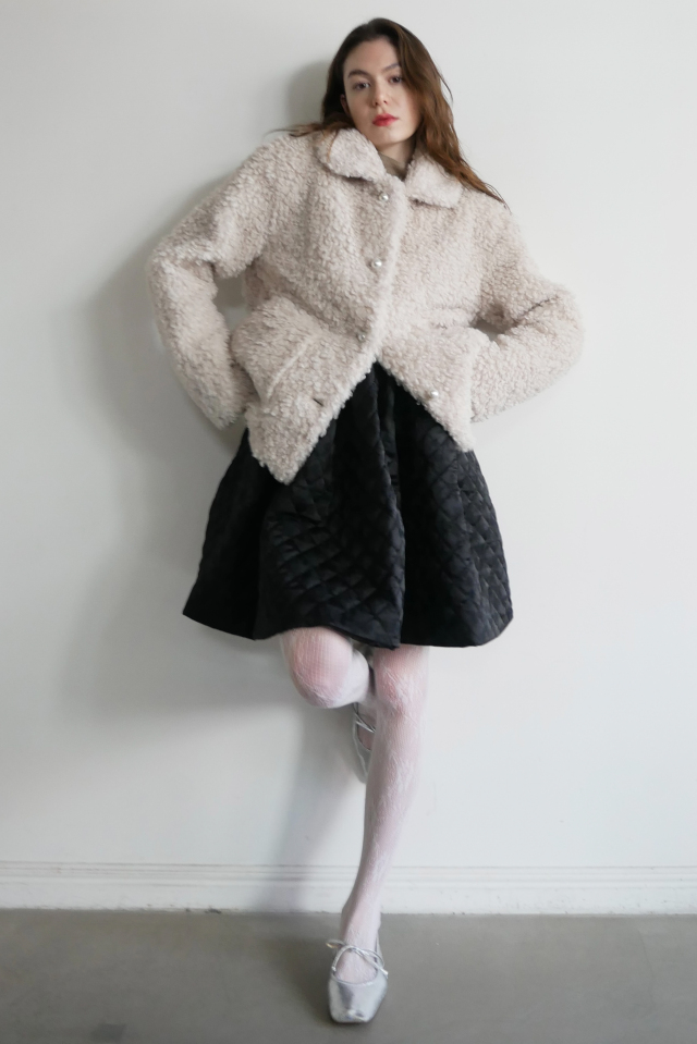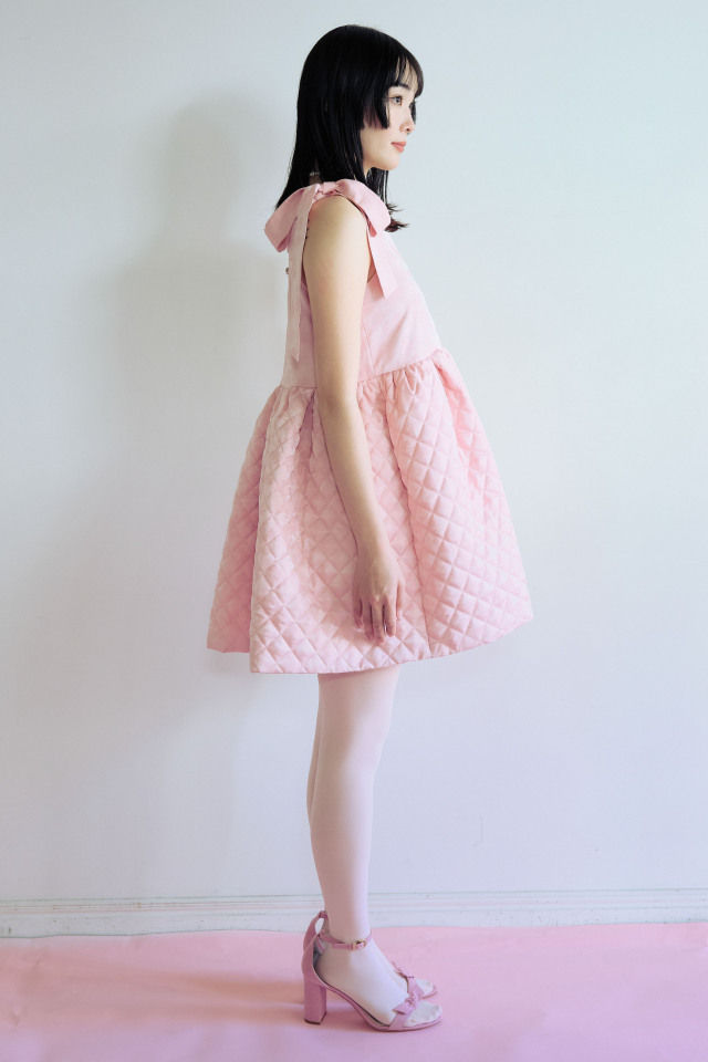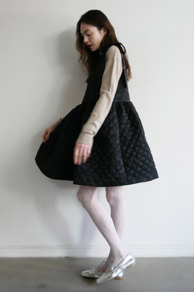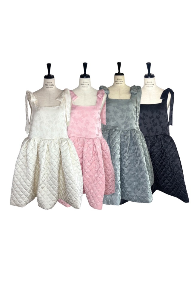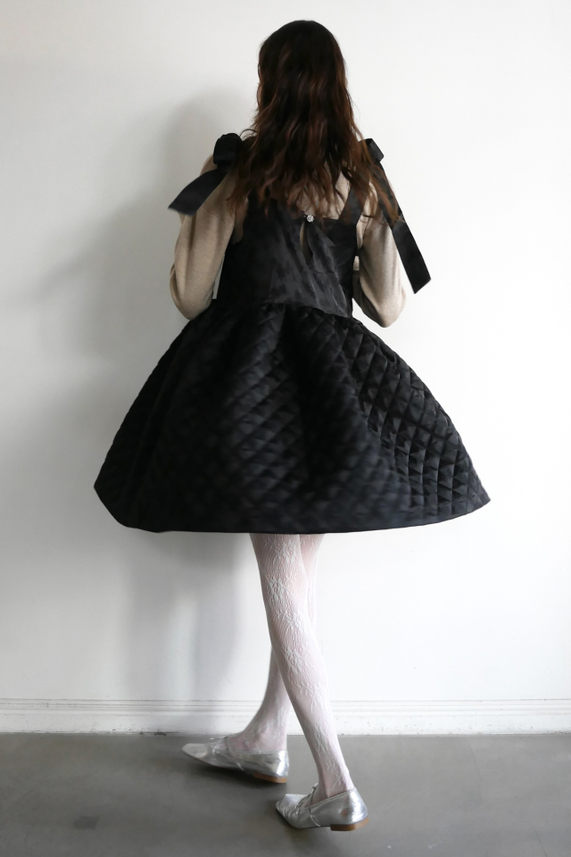 ・同素材のquilting rose satin peplum coat(25W-DR-OT01)とセットアップで、特別感のある冬のお出かけコーデに