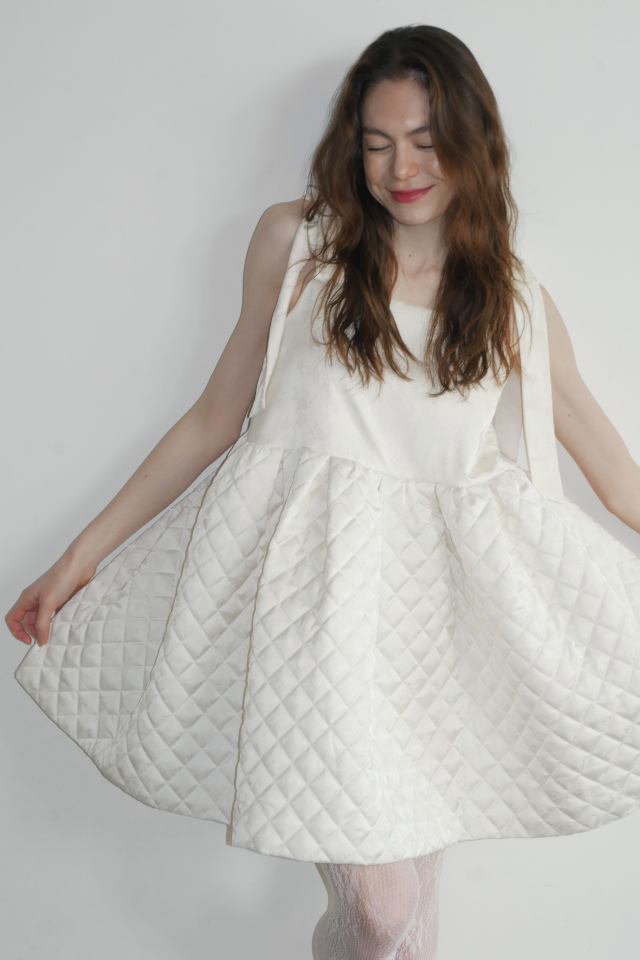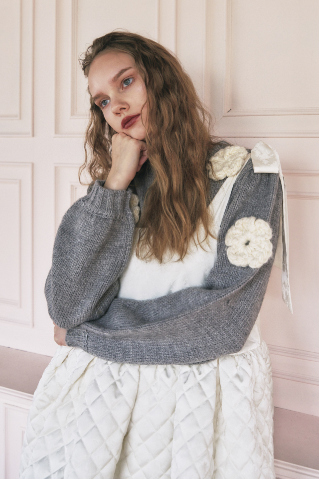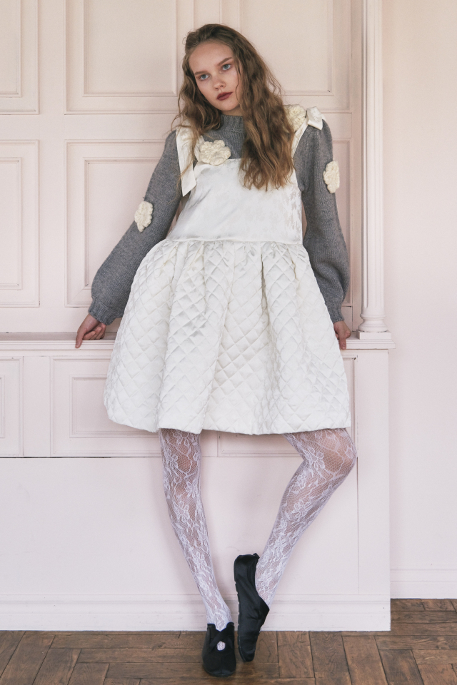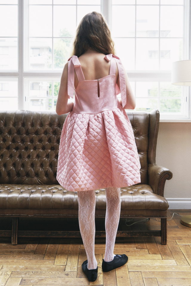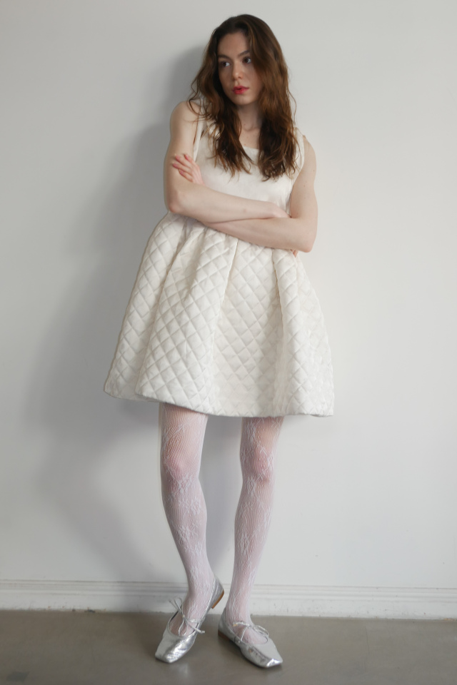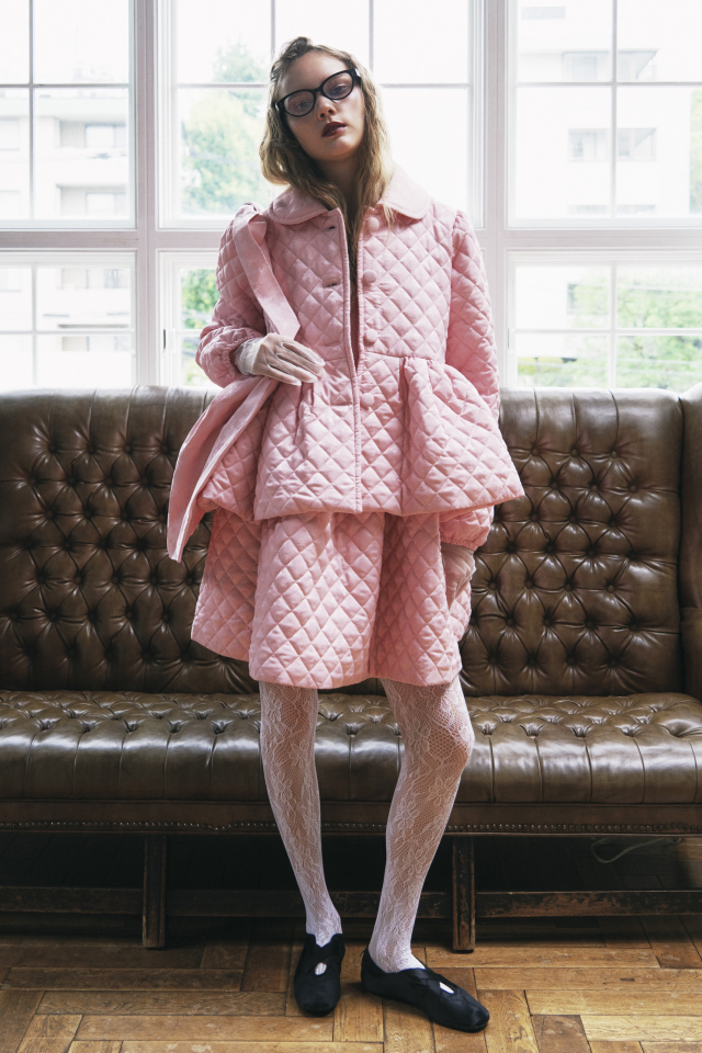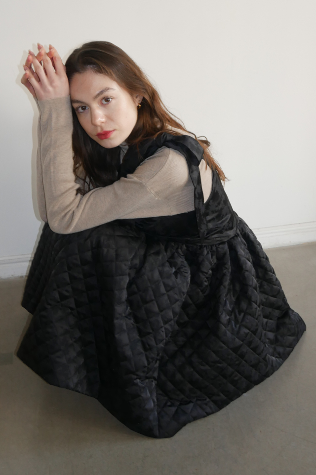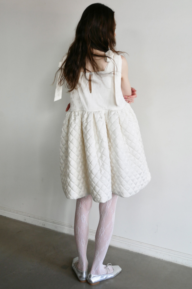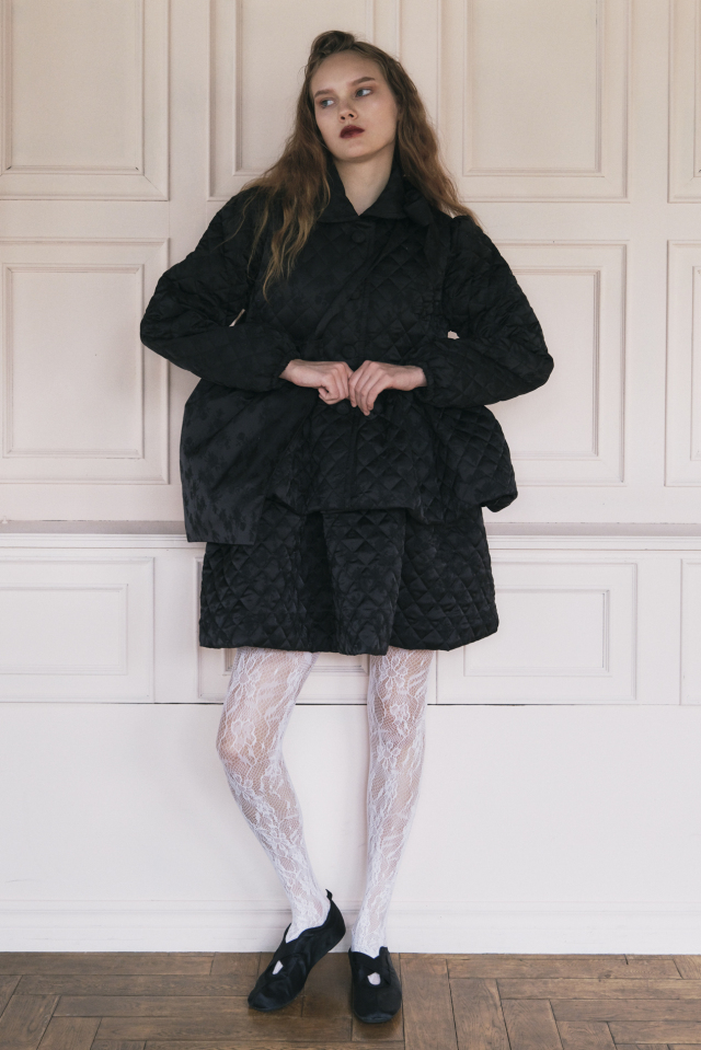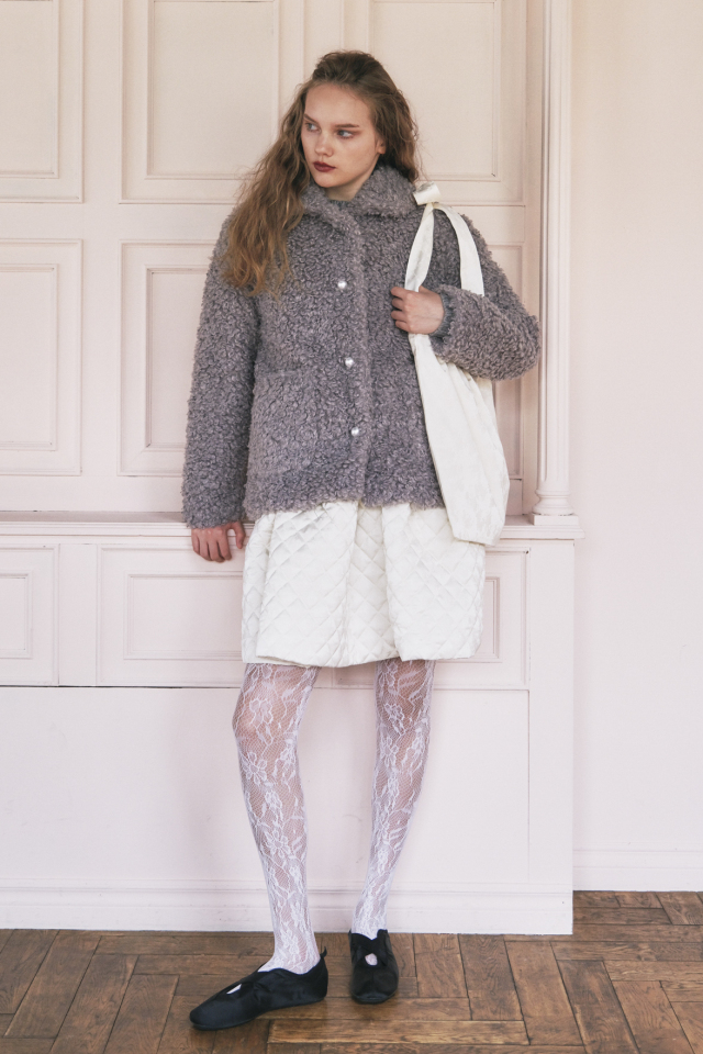 ・同素材のquilting rose satin peplum coat(25W-DR-OT01)とセットアップで、特別感のある冬のお出かけコーデに