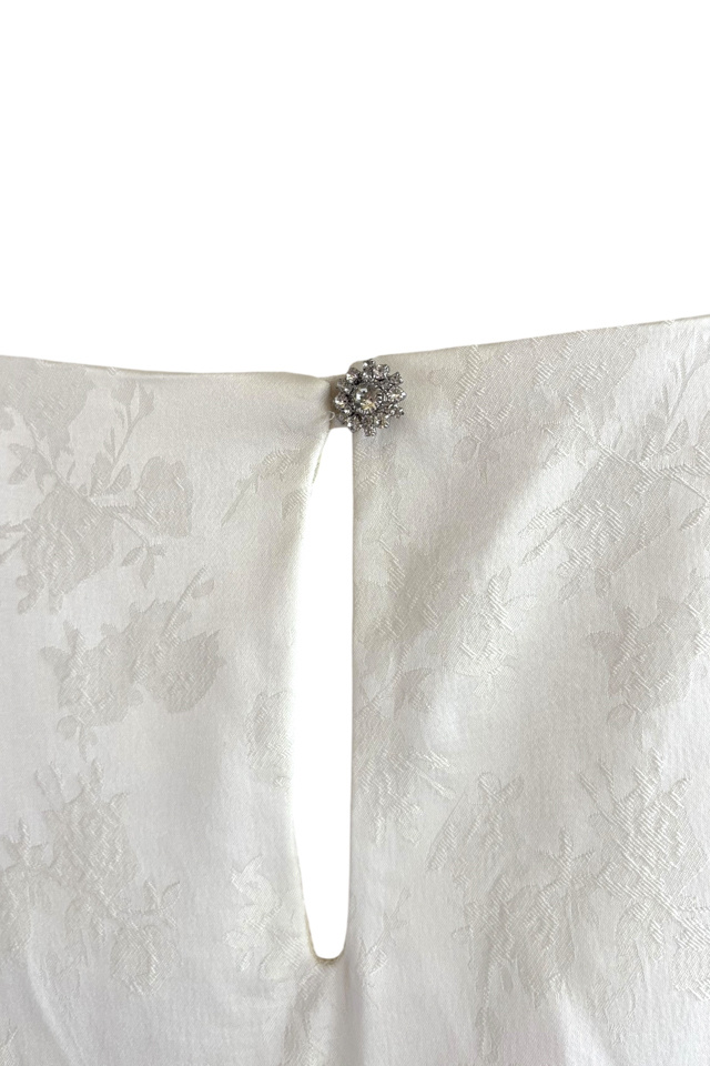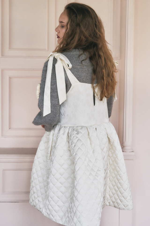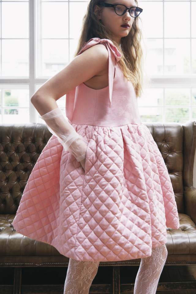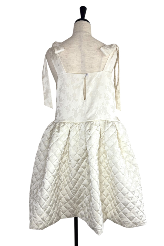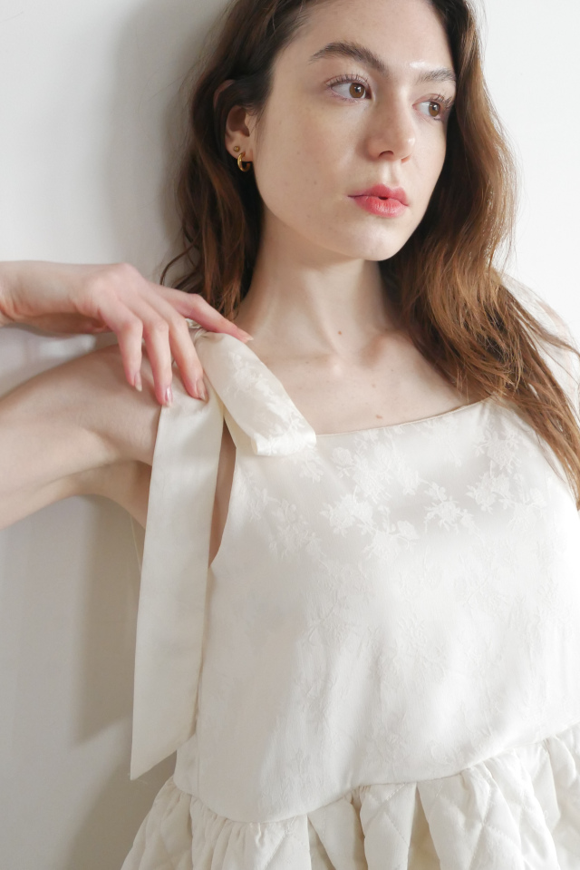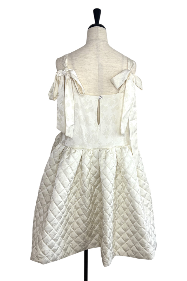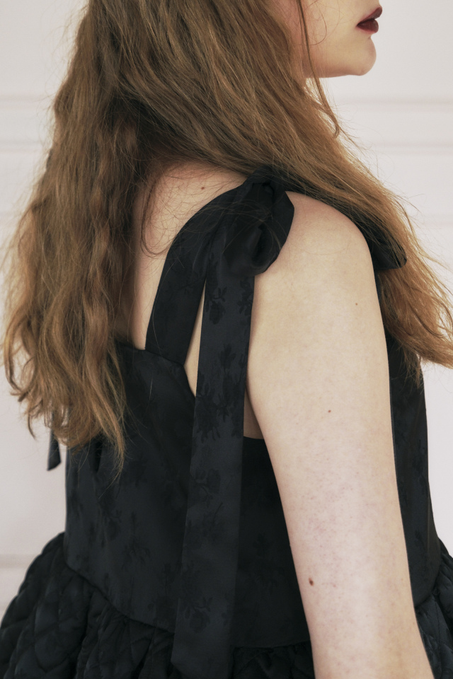 ・立体的なローズ柄を施した光沢サテン×キルティングの切替デザイン