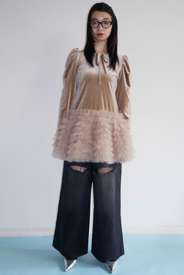 ルーズなワイドシルエットが体のラインを拾わず、スタイリッシュな印象に。