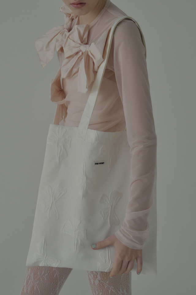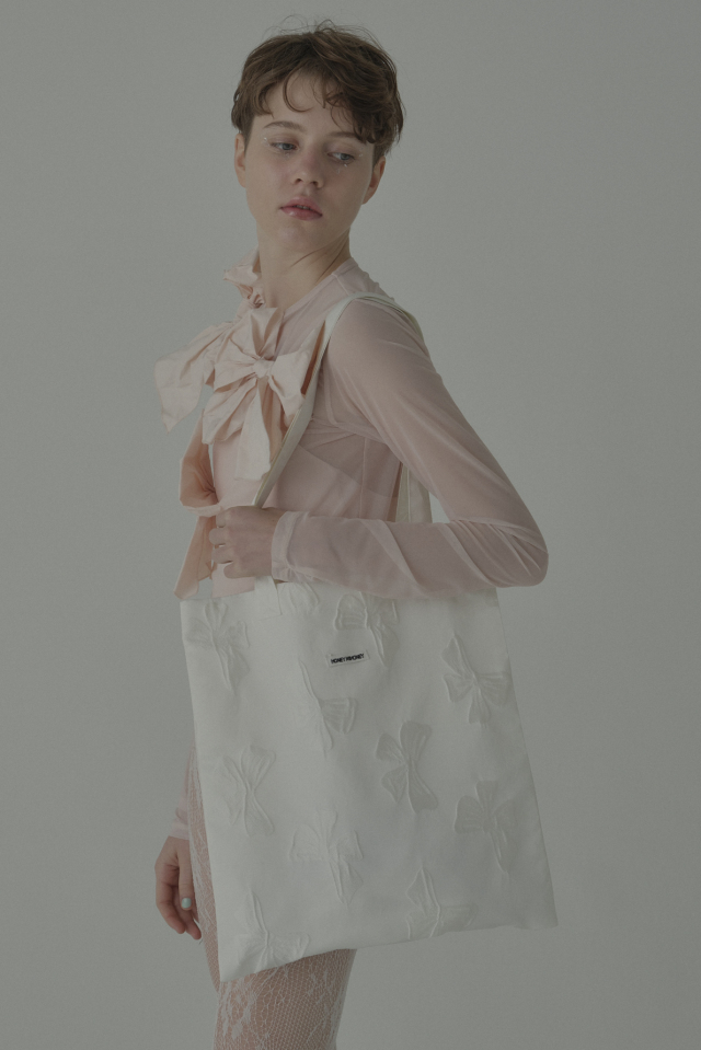 立体的なリボンジャガードが視線を惹きつけ、持つだけでスタイリングを華やかに引き立てます。