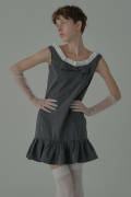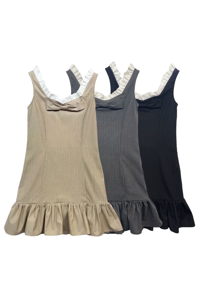 ピンストライプ×フリルの異素材レイヤードが印象的な、ミニワンピース。