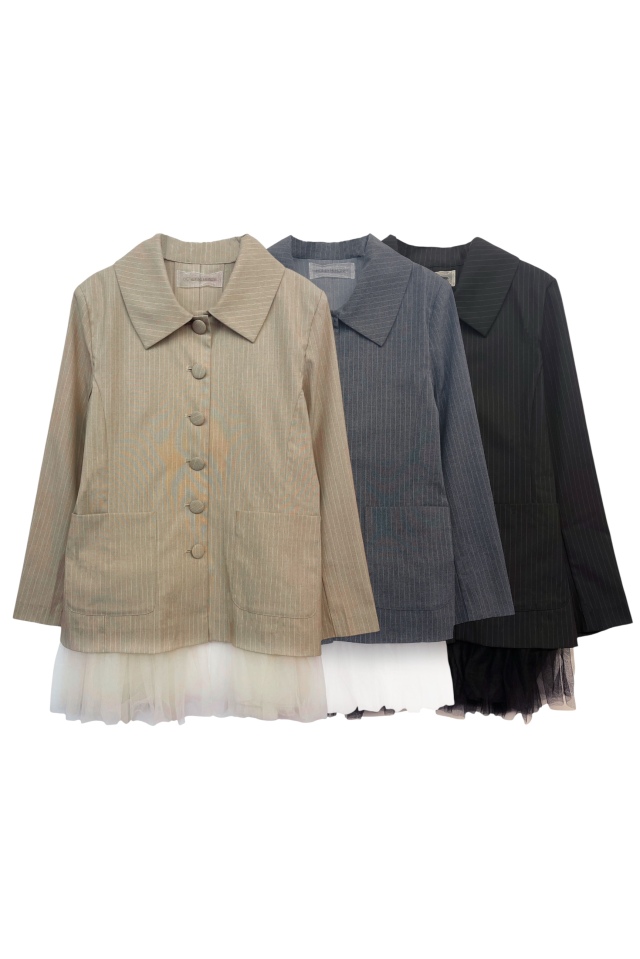 ピンストライプと大きなクルミボタンが魅力の、春の主役ジャケット。