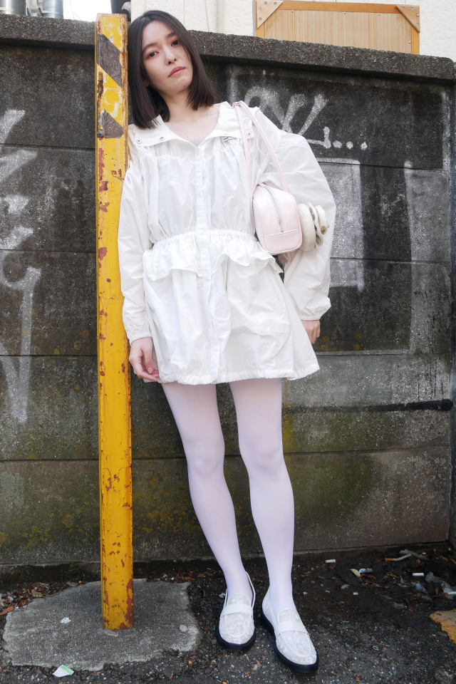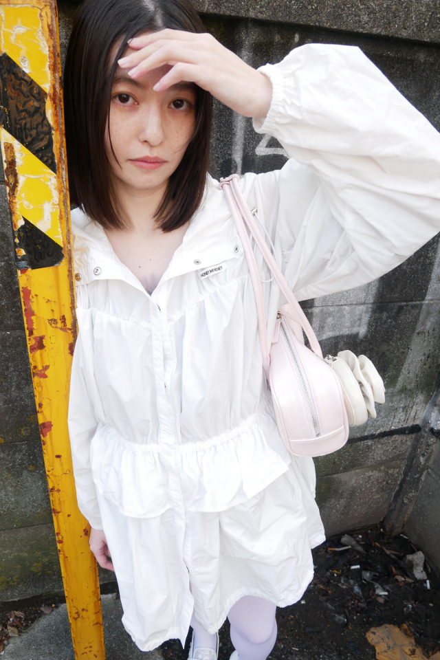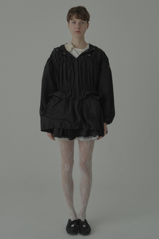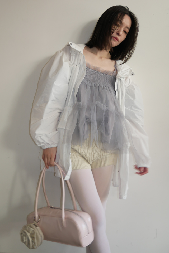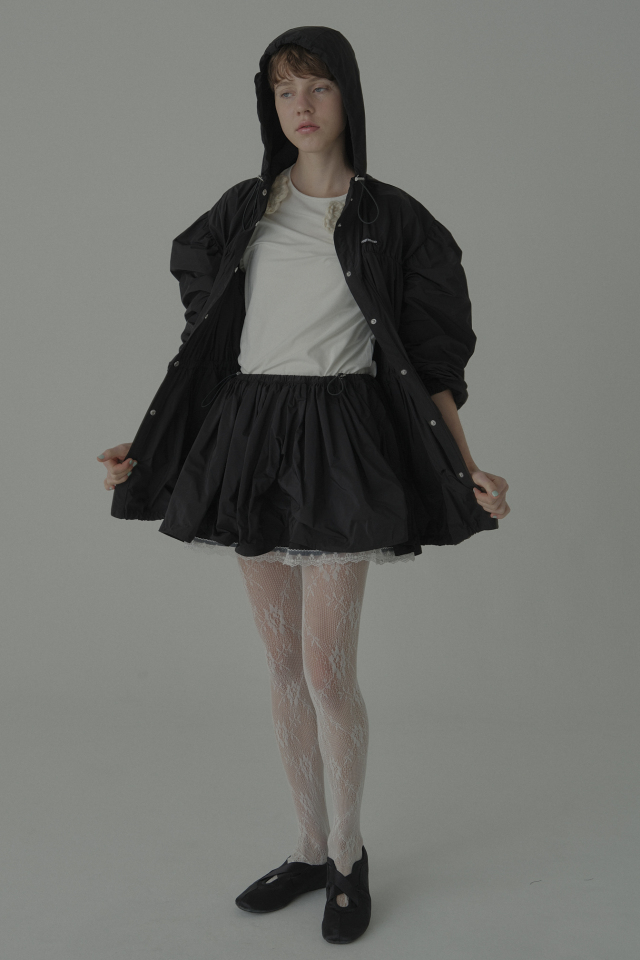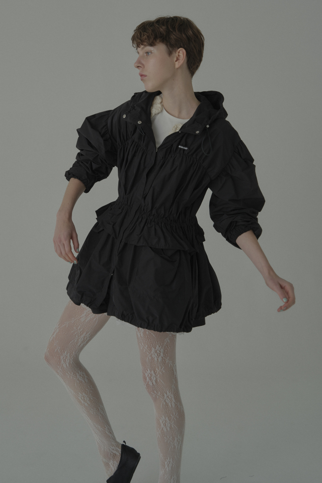 同素材のtaffeta layered drape mini skirt( 26S1-DR-SK02)とのセットアップで、より存在感のあるスタイリングに。