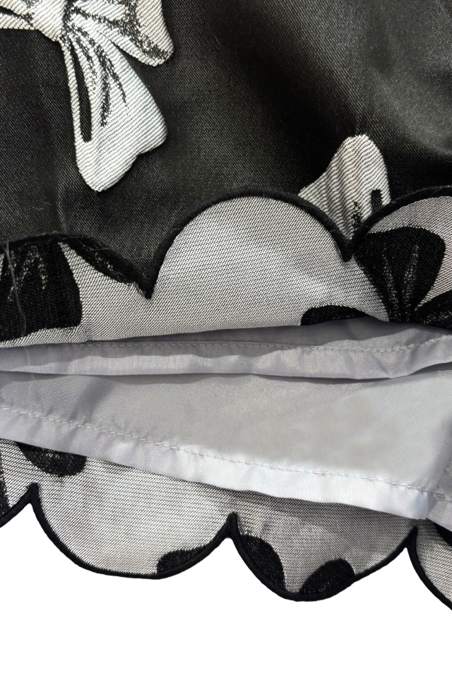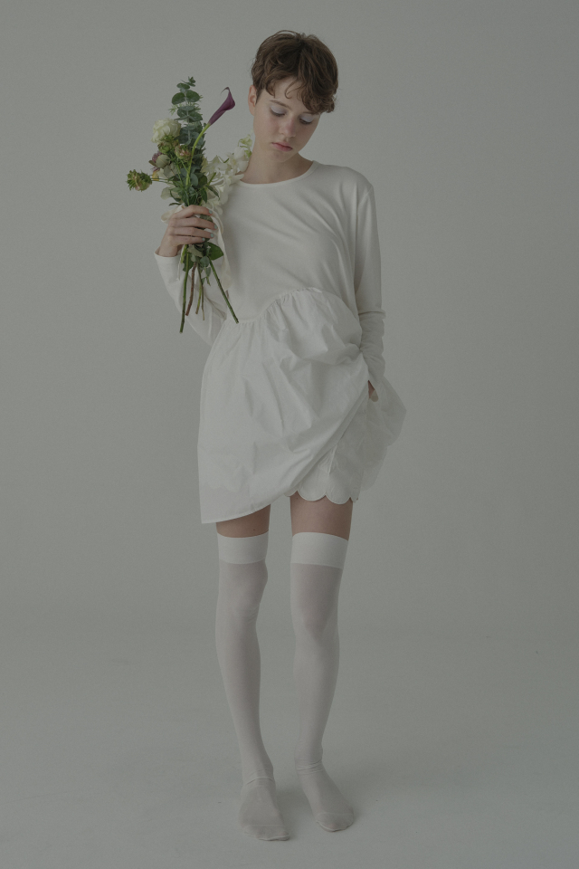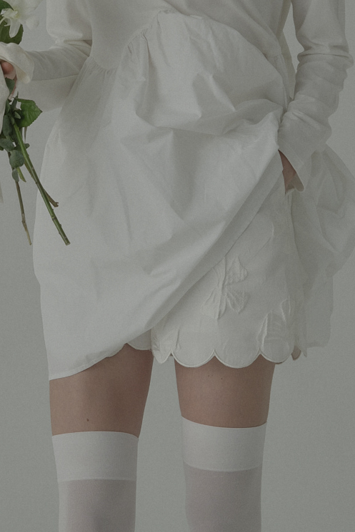 ほどよく広がるAラインシルエットが脚まわりをすっきりと見せ、スカラップの裾が可憐なアクセントを演出するデザイン。
