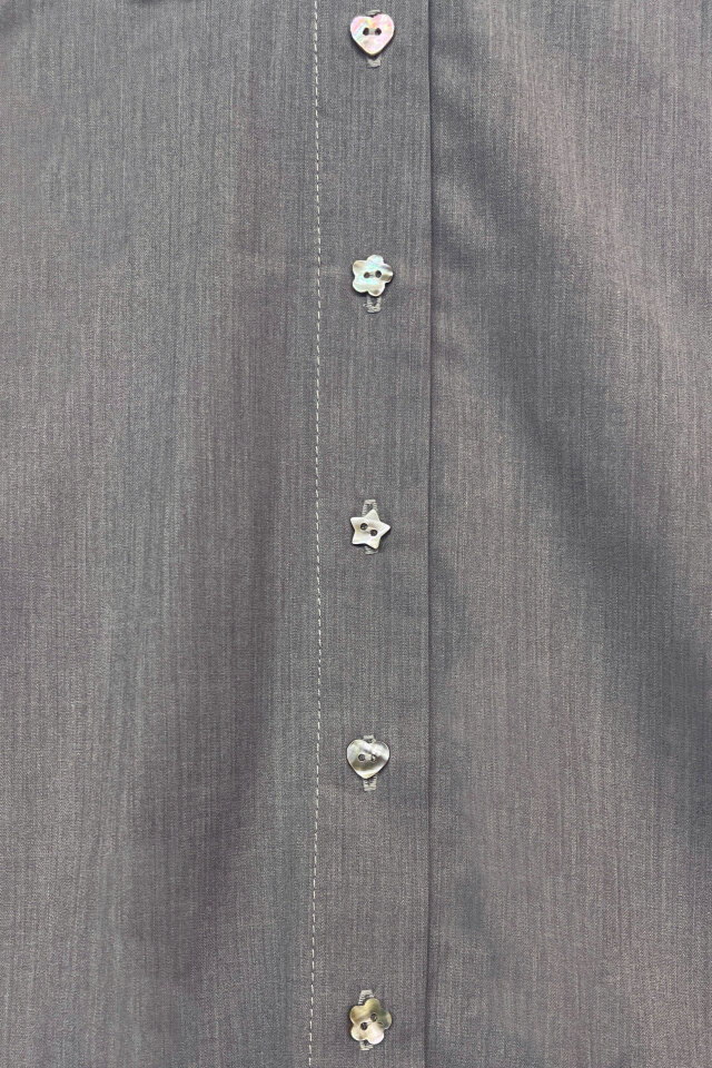 さらりと軽やかな生地に、肩まわりの繊細な刺繍レースと天然のシェルボタン(星/ハート/花モチーフ)が上品な華やぎを添えます。