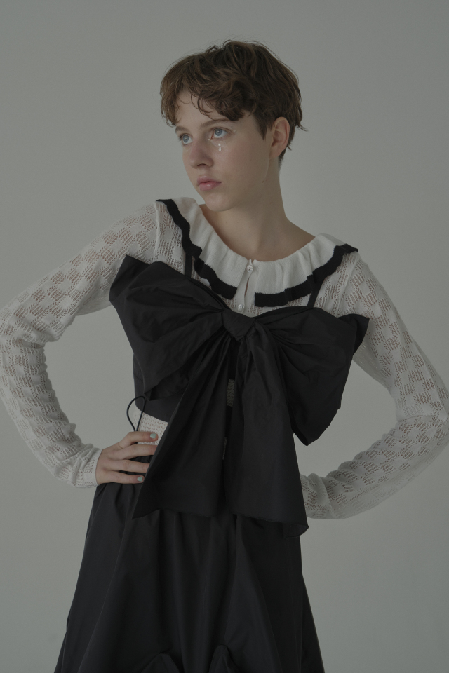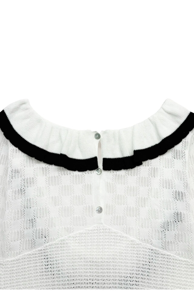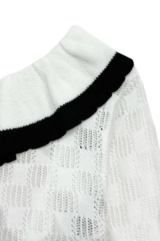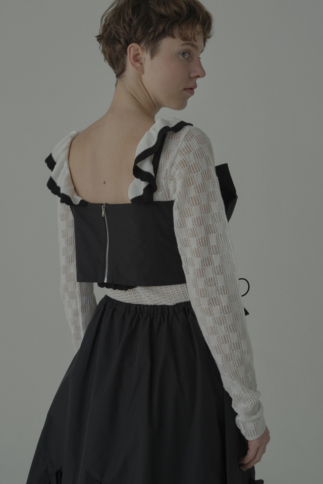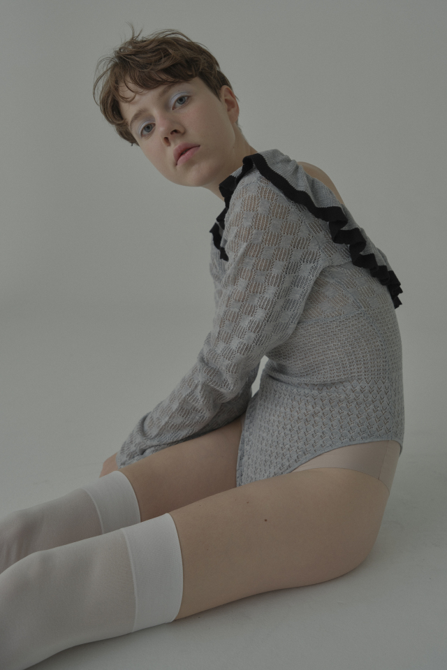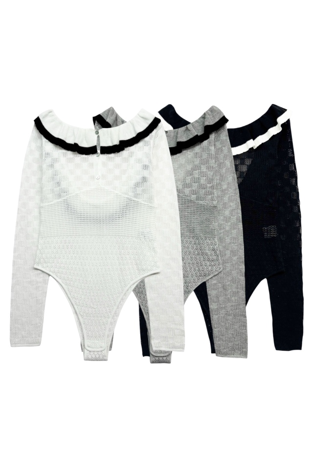 繊細なフリル×透け感ニットがフェミニンムードを引き立てる、ボディスーツタイプのトップス。