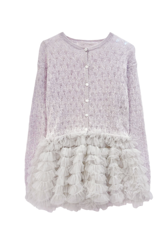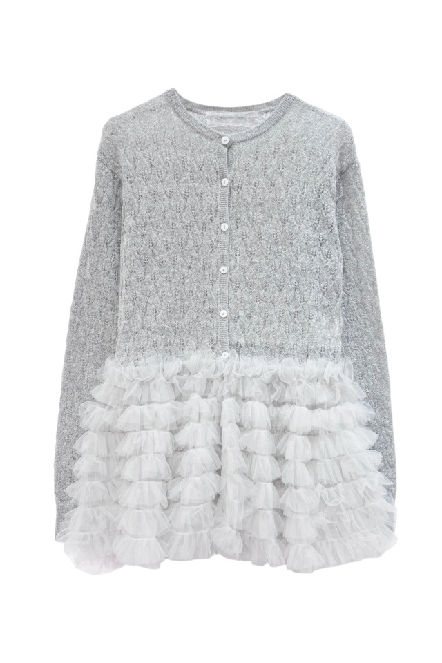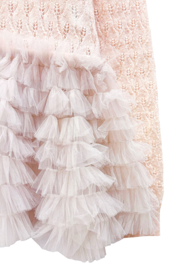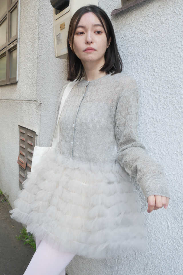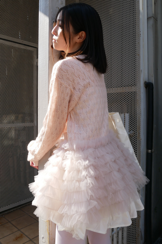 柔らかなモヘア混素材に、レース調編みとチュールを重ねたペプラムが上品な印象に。