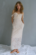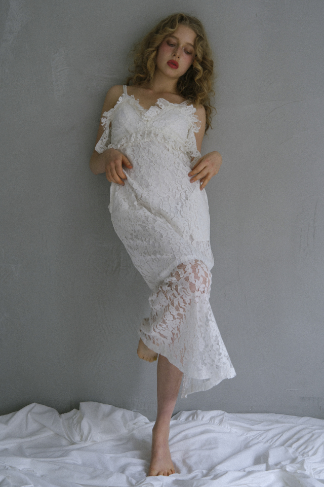 上品に女性らしいシルエットを引き立てる、レース×ベロアドッキングのオフショルキャミワンピース。