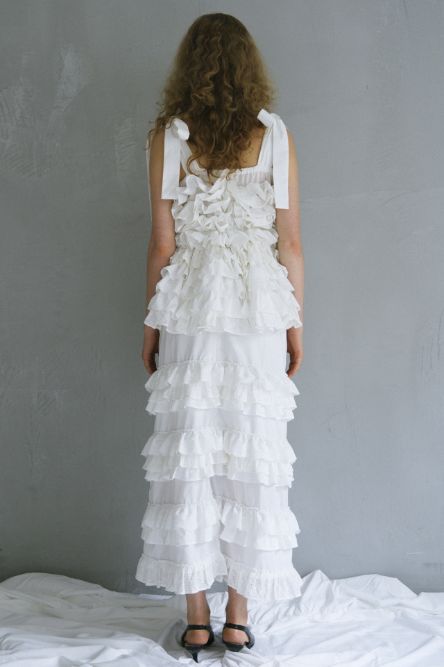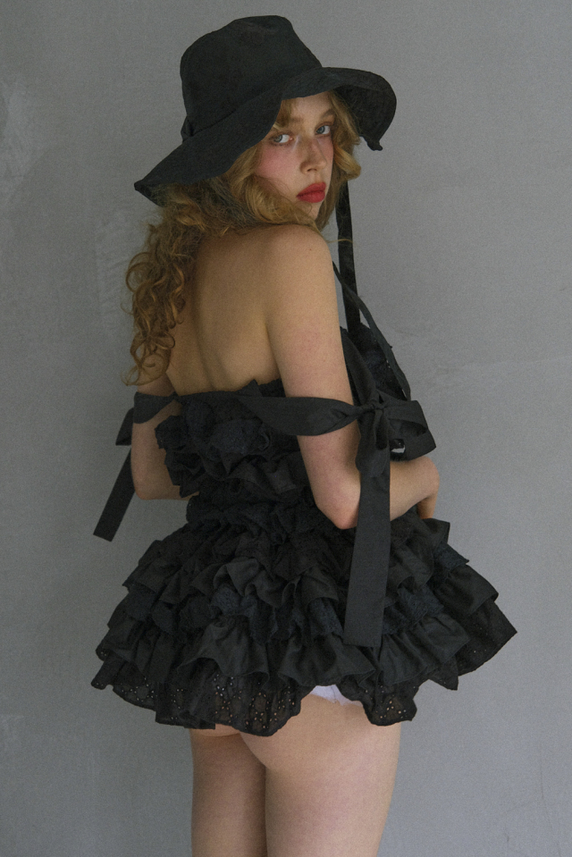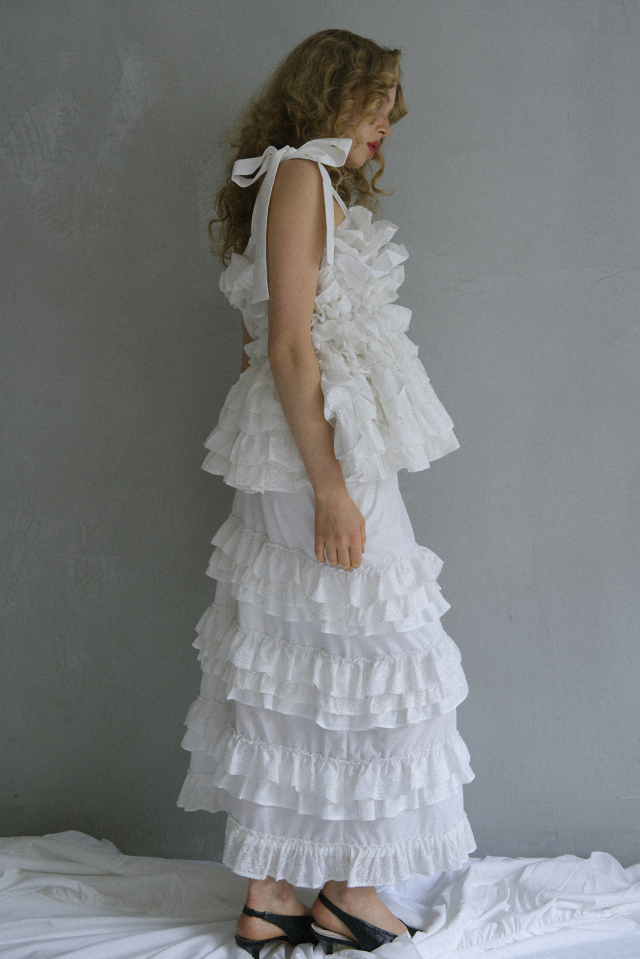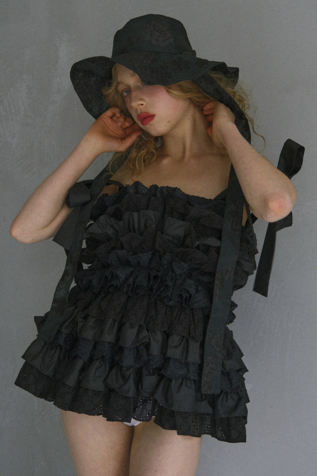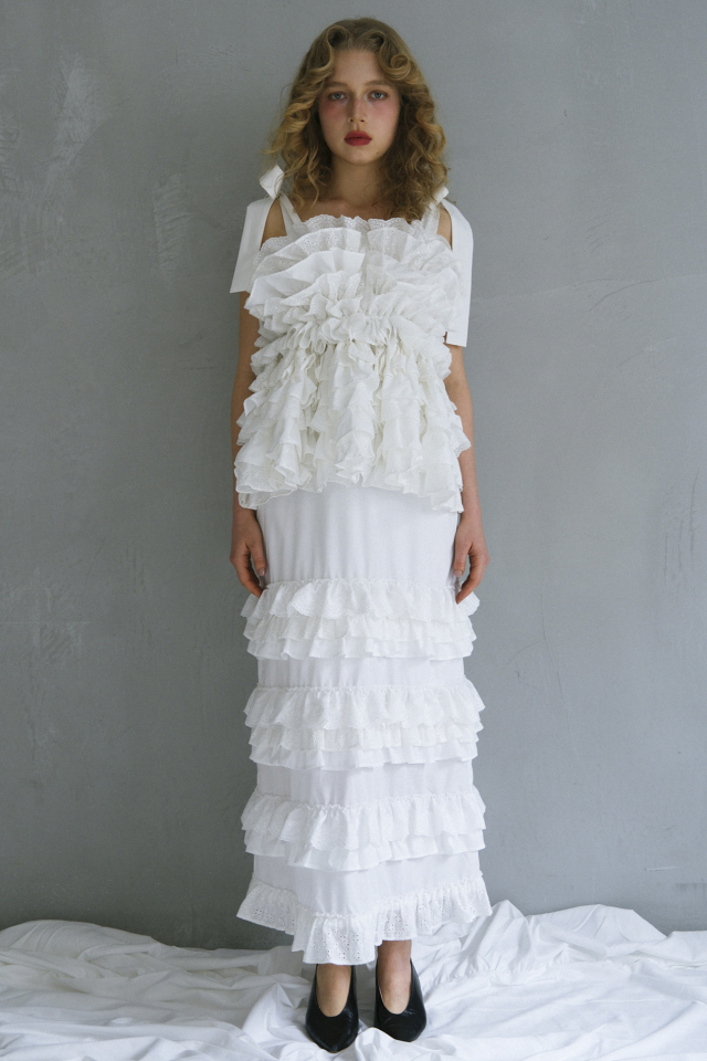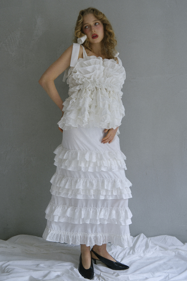 同生地のcotton lace tiered long skirt(26S2-DR-SK01)と合わせれば、レースの存在感が際立つ印象的なセットスタイルに。