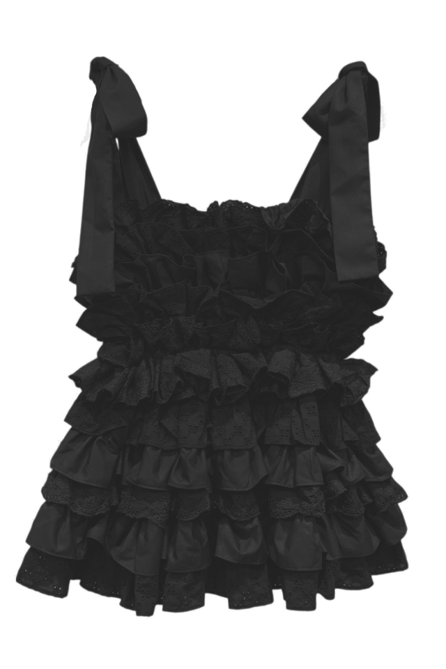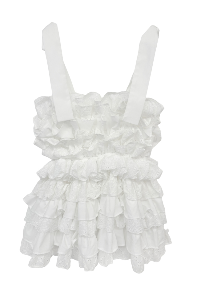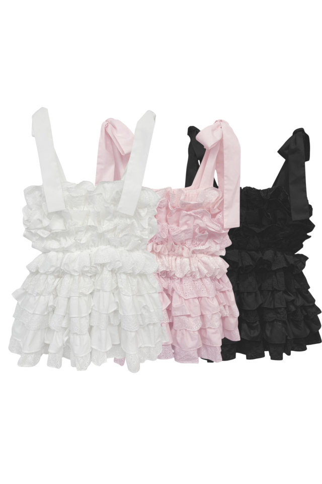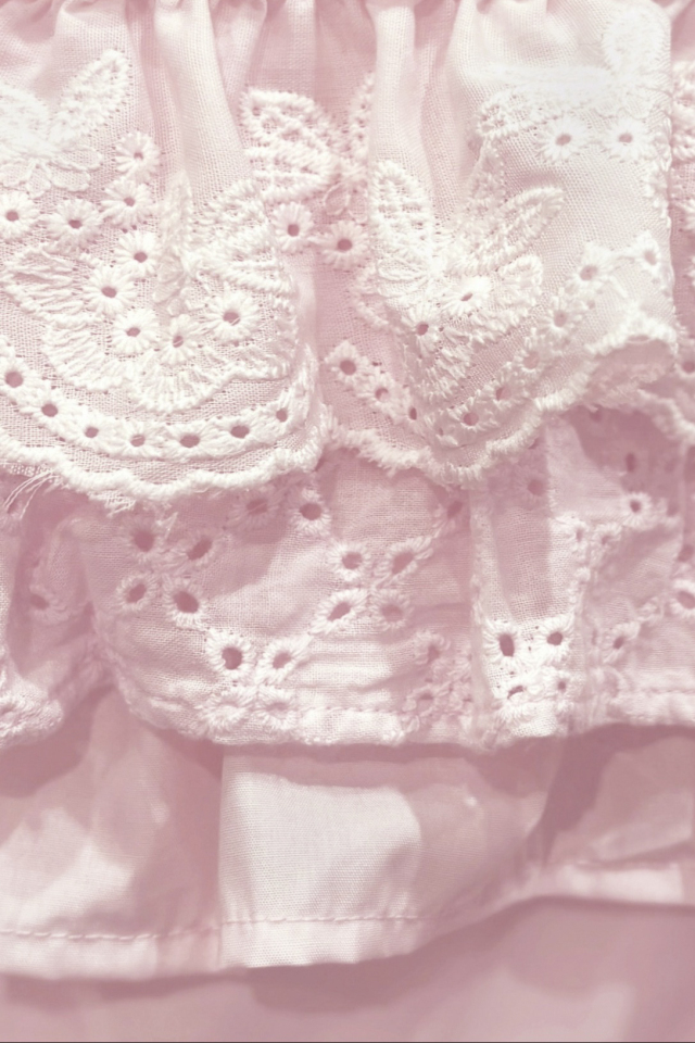 コットン主体のナチュラルな風合いに、無地×トーションレース×スカラレースを組み合わせた華やかなティアードデザイン。