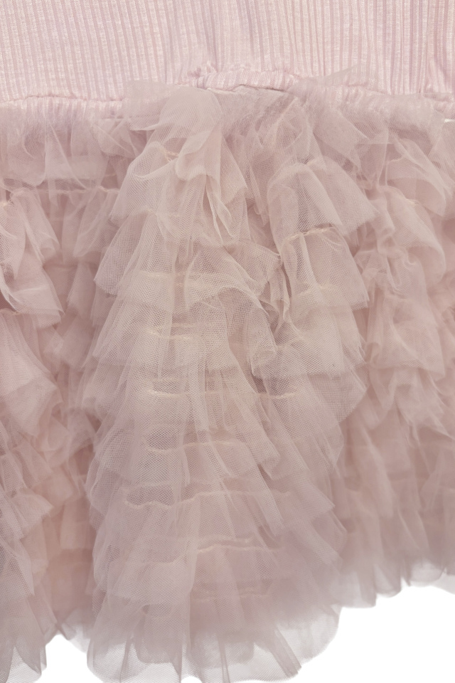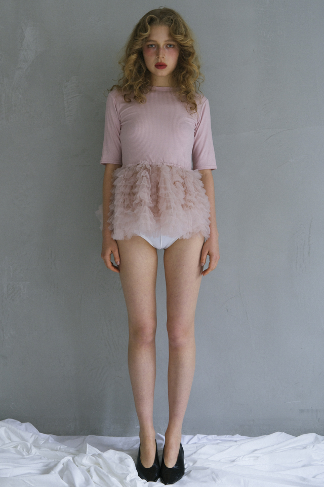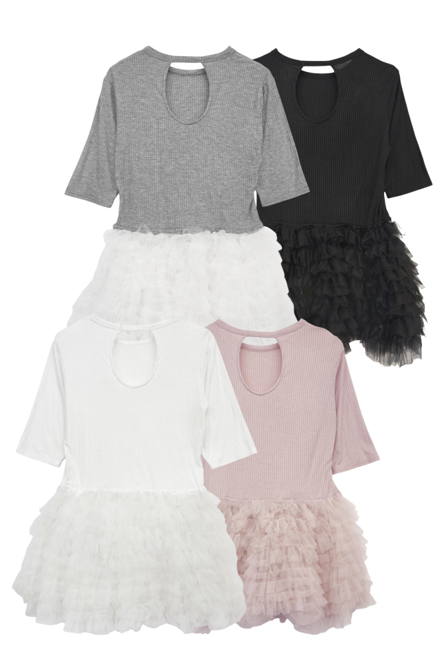 さらりと纏えるレーヨン系リブに、ふんわり広がるチュールペプラムをドッキングした夏用ペプラムシリーズ。