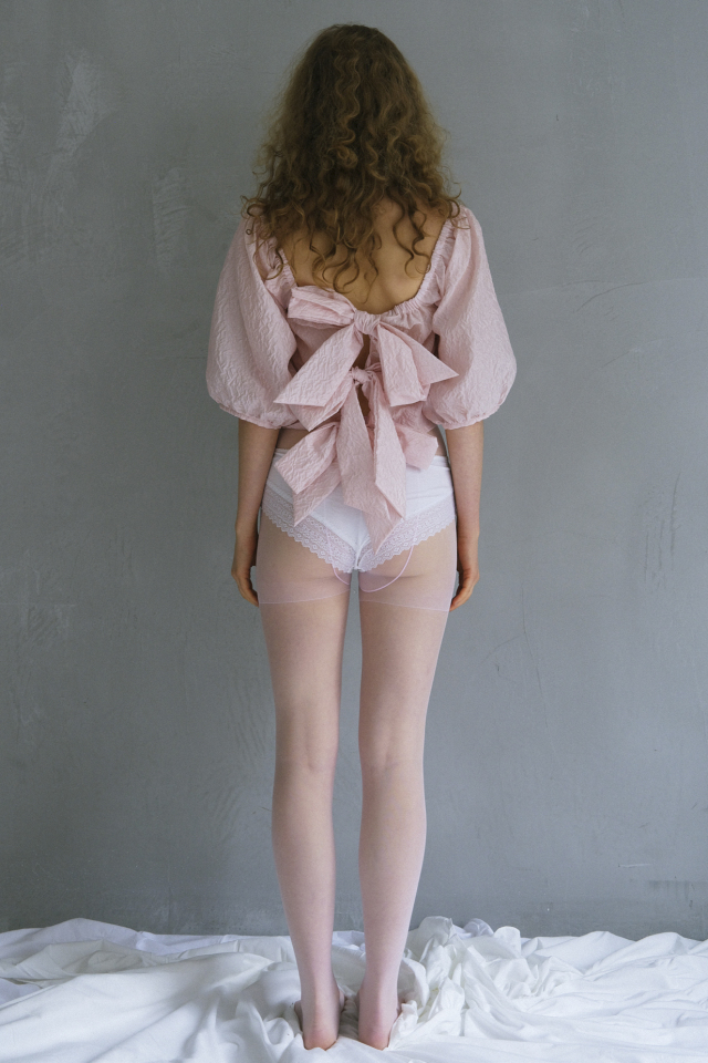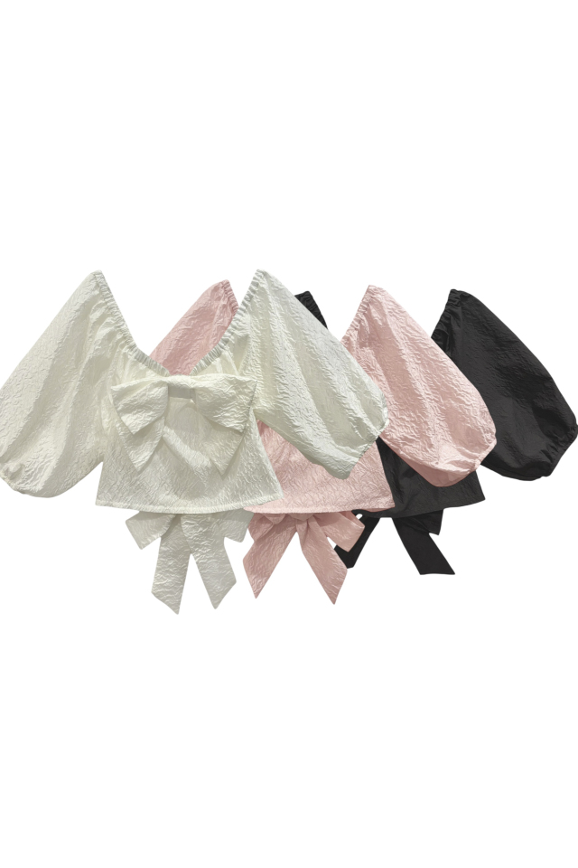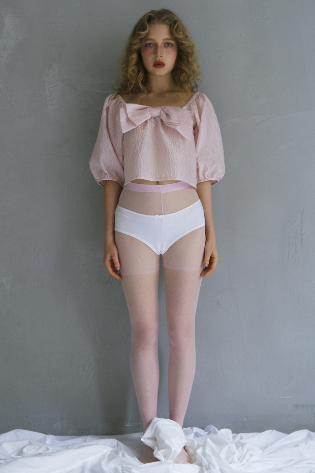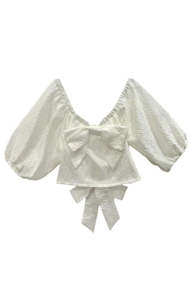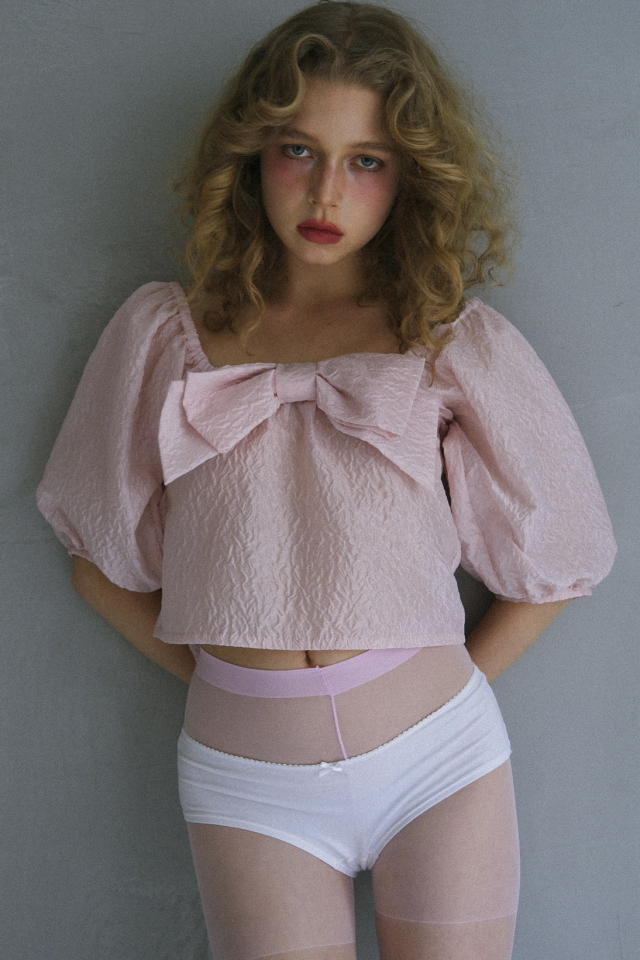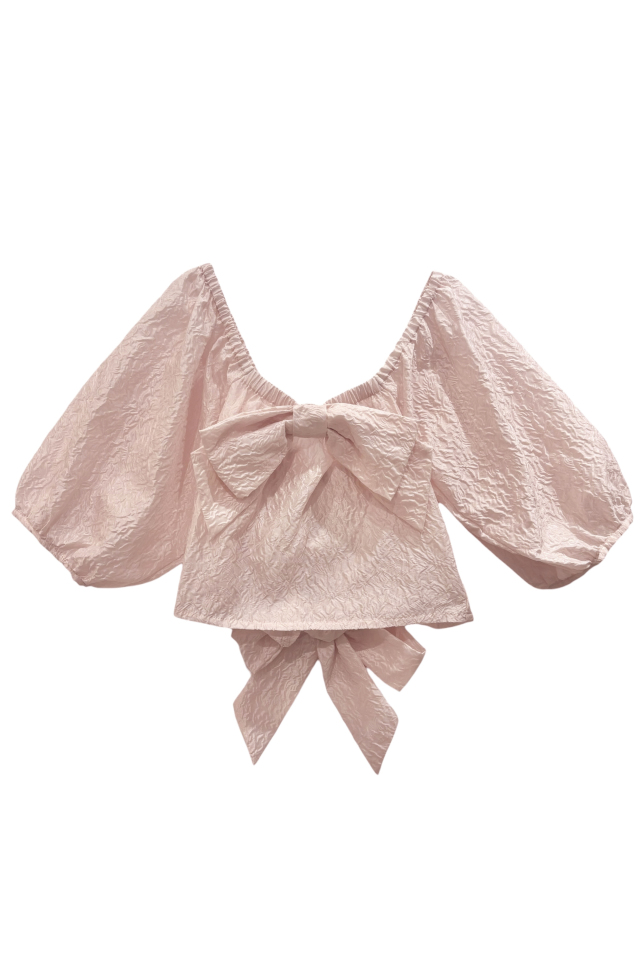 3つのリボンが視線を惹きつける、立体感を纏うオーガンジージャガードブラウス。