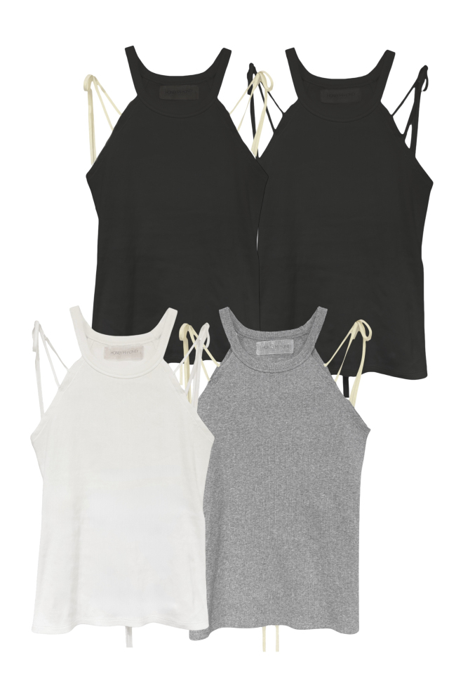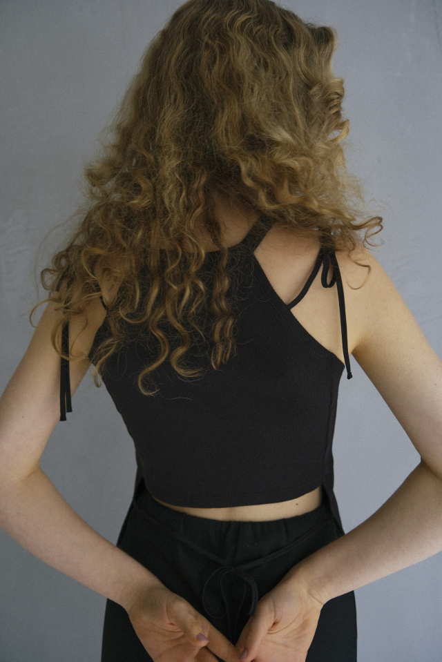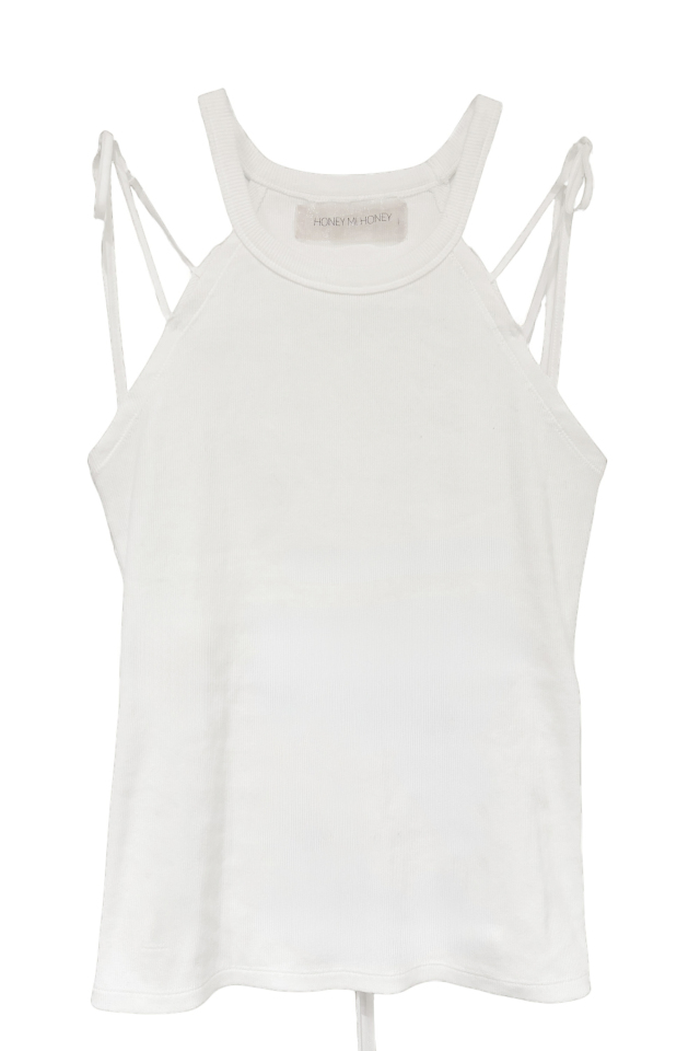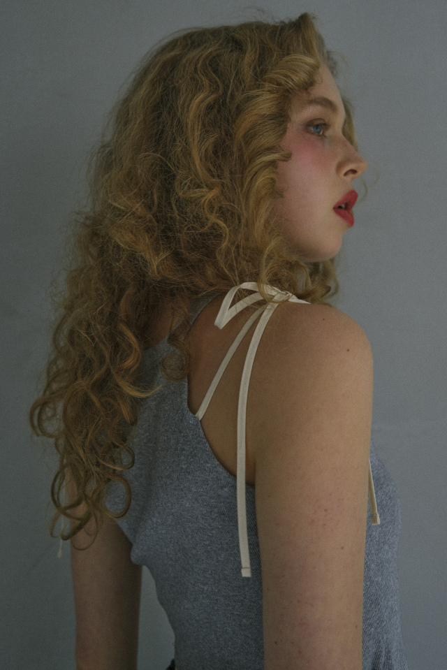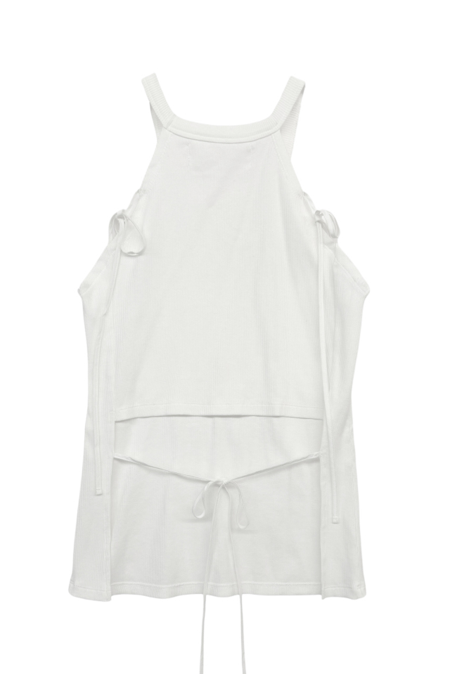 肩に添えた華奢なリボンがアクセントになる、リブタンクトップ。