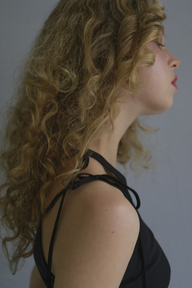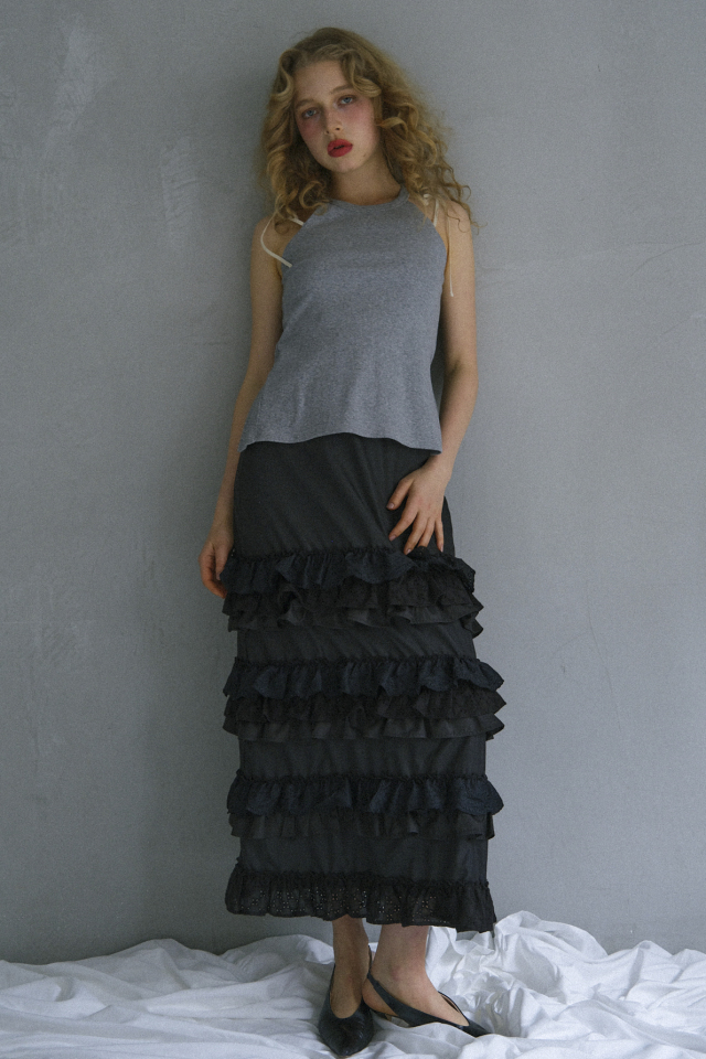 同素材のrib frill long skirt(26S2-DR-SK02)と合わせた、統一感のあるセットアップスタイルもおすすめです。
