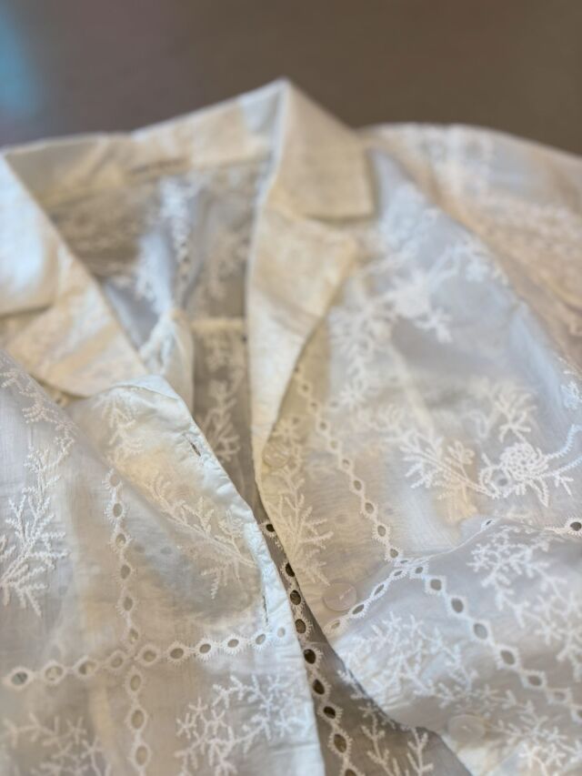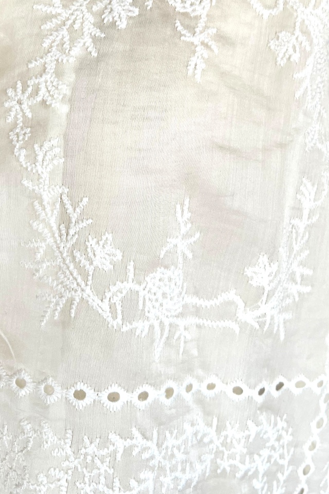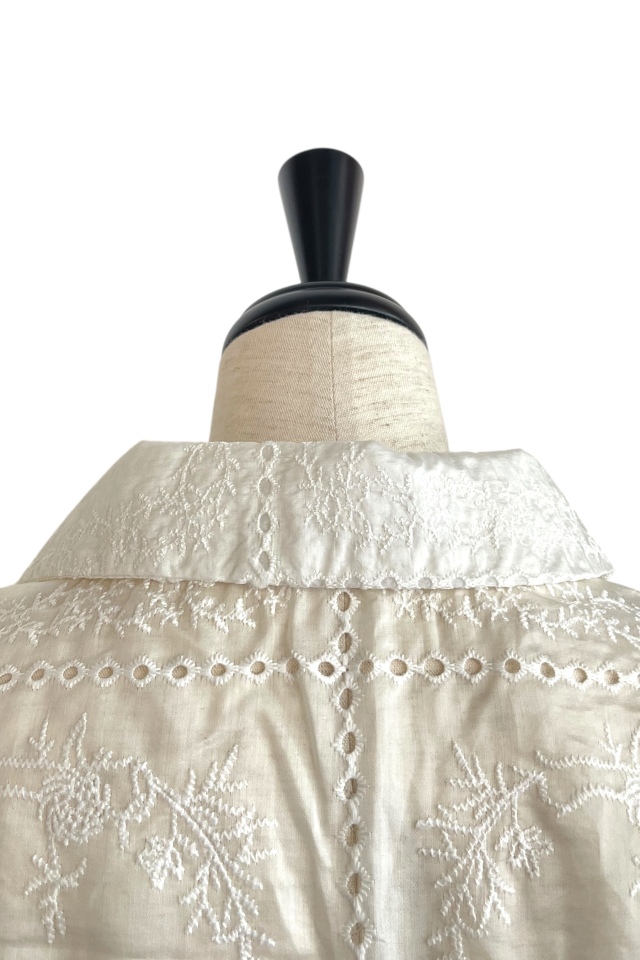 軽やかな生地に、立体感のある刺繍をふんだんに施し、清楚なムードと華やかさを兼ね備えた一枚。