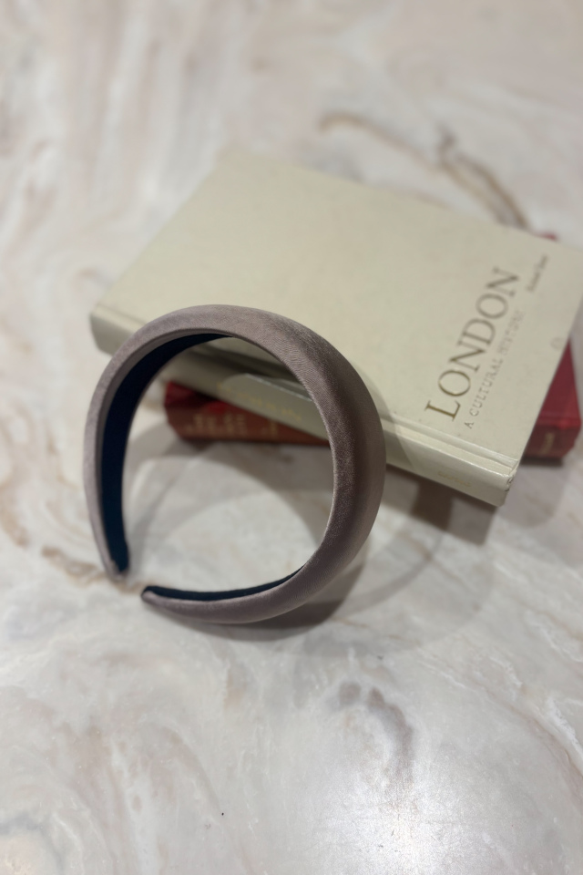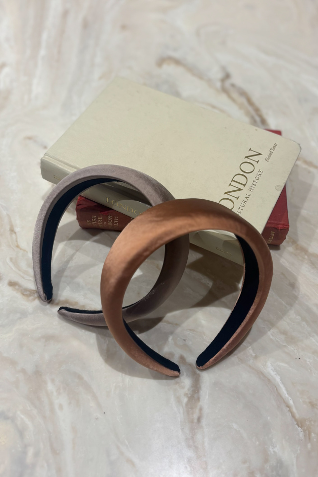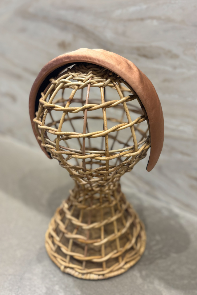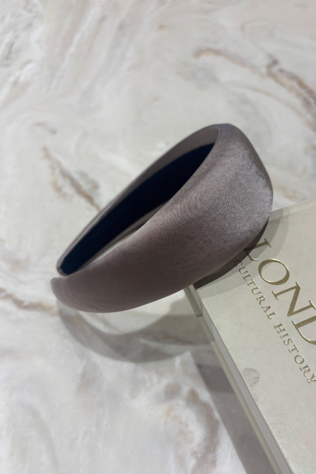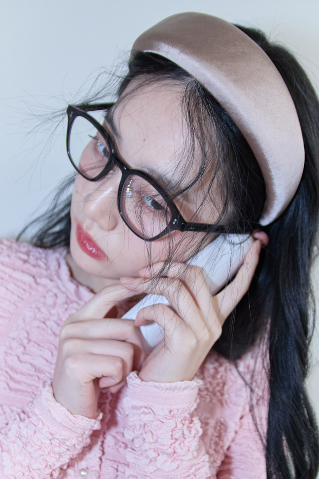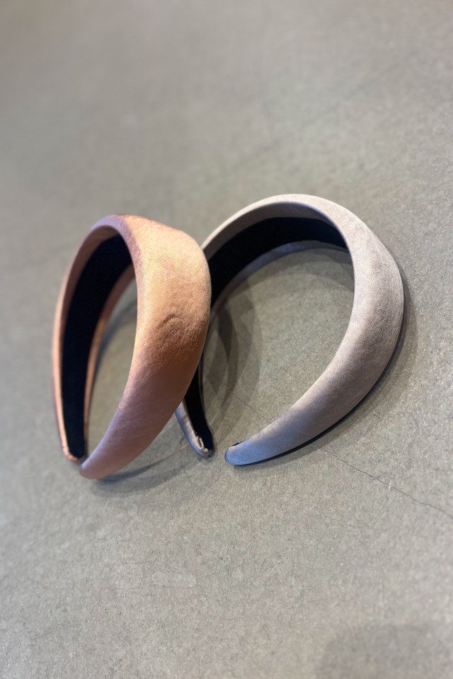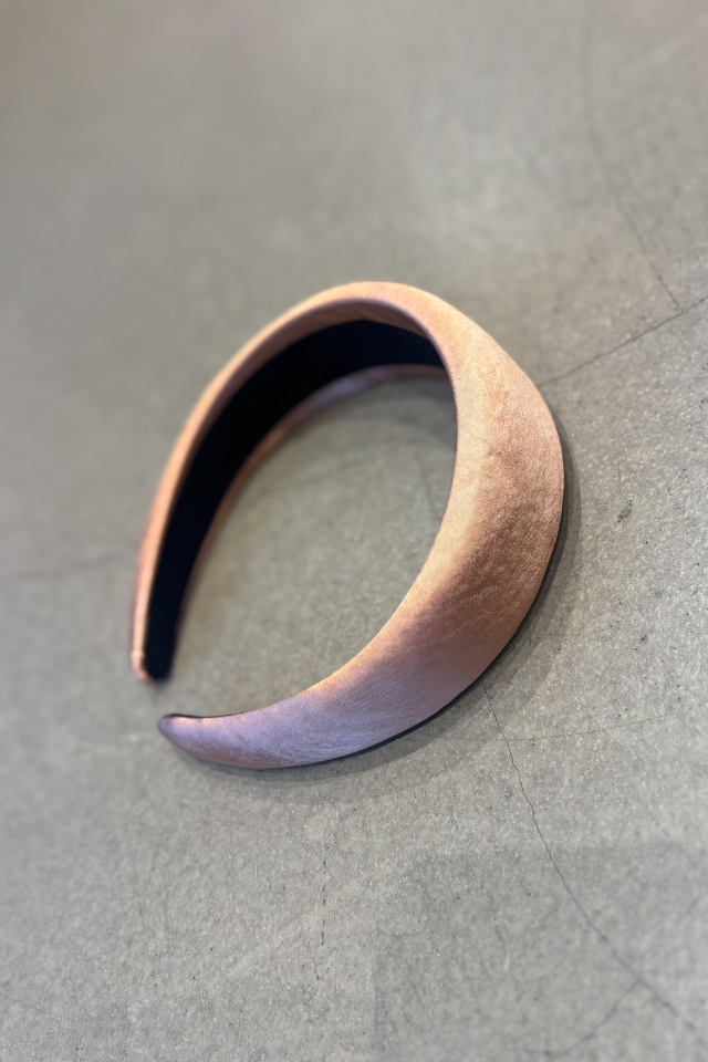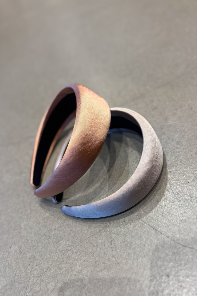 丸みのあるフォルムとベロアの光沢が目を引く、存在感のあるカチューシャ。