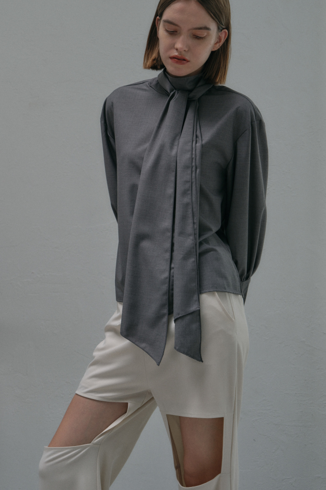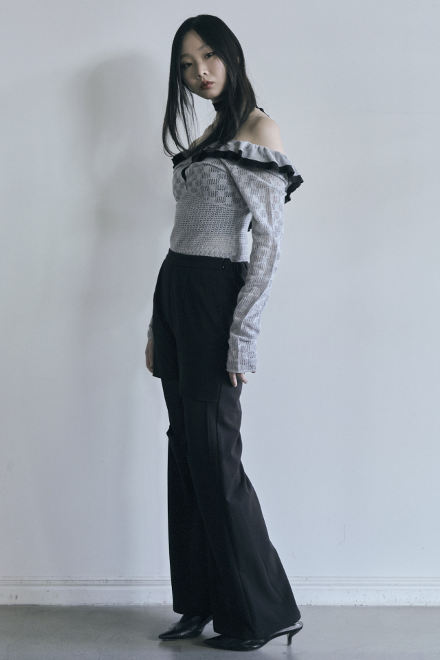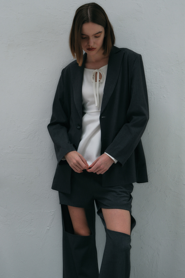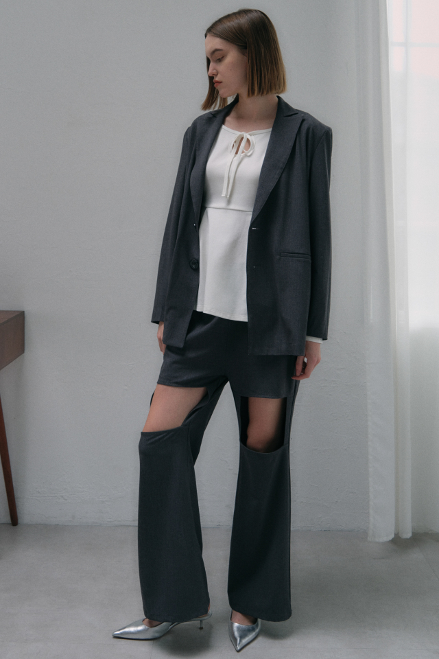 同素材の double ribbon open jacket(E25W-DR-OT01) と合わせてセットアップでモードに