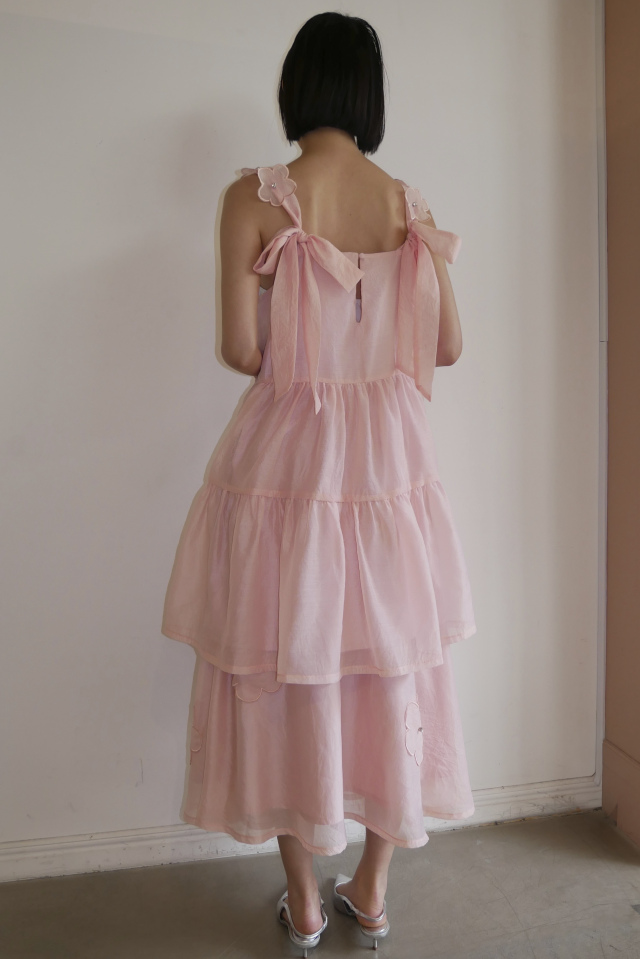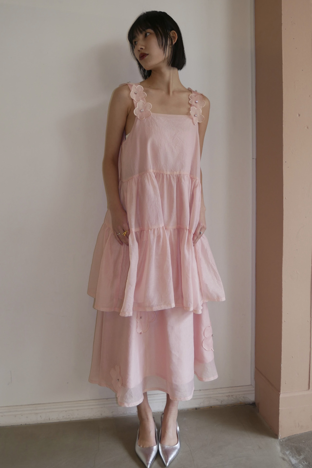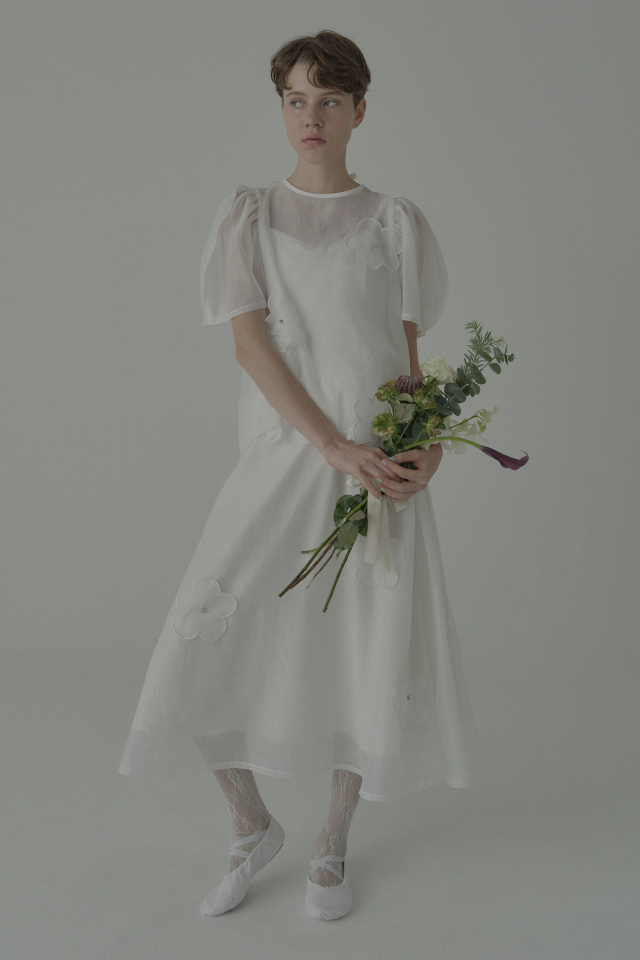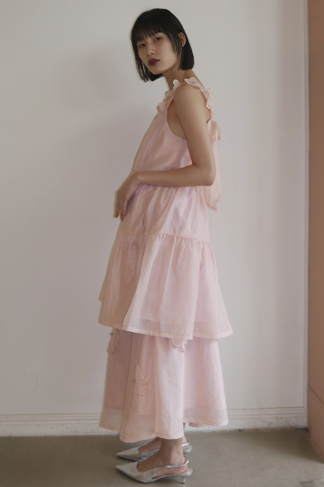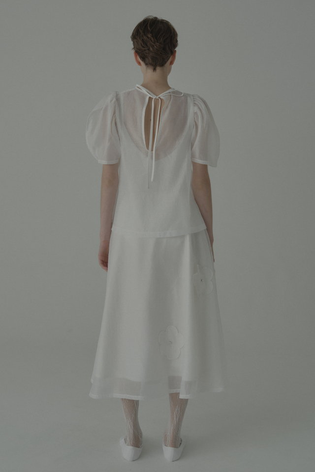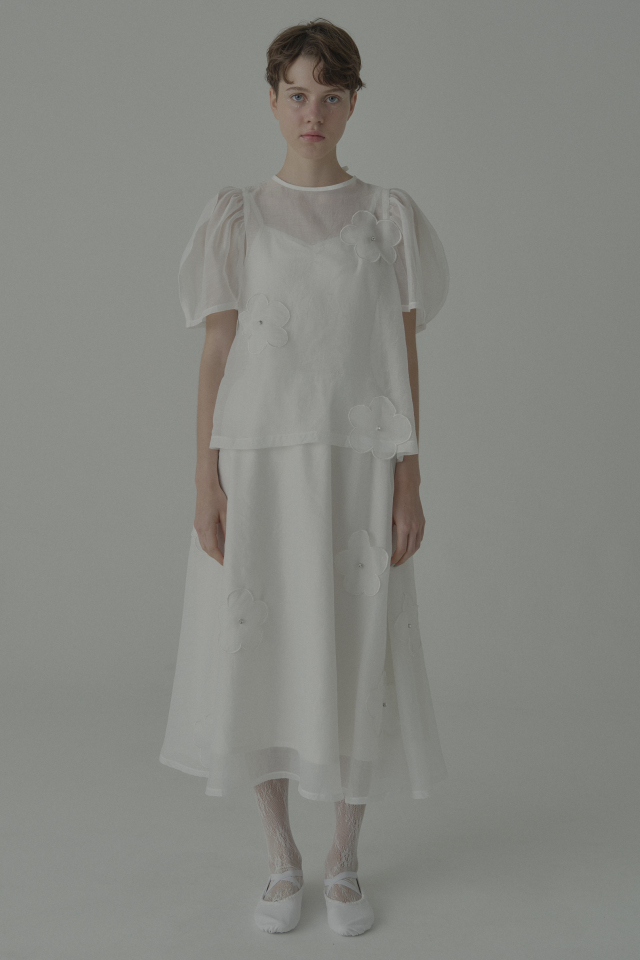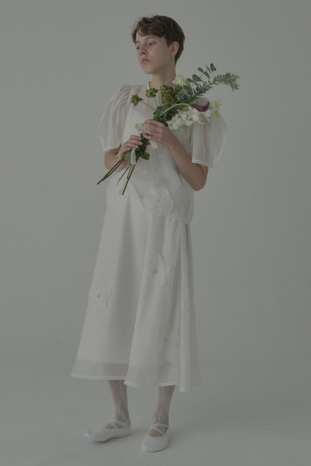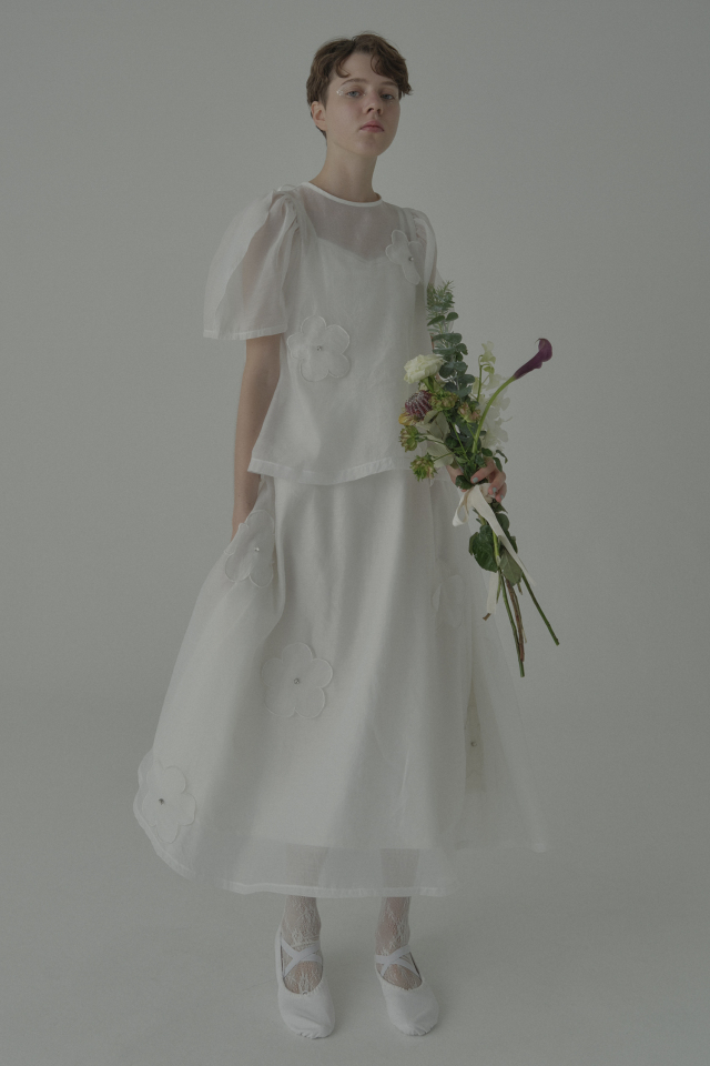 ・同シリーズの flower organdie puff blouse(P26S1-DR-TP04)とセットアップで華やかなスタイルに