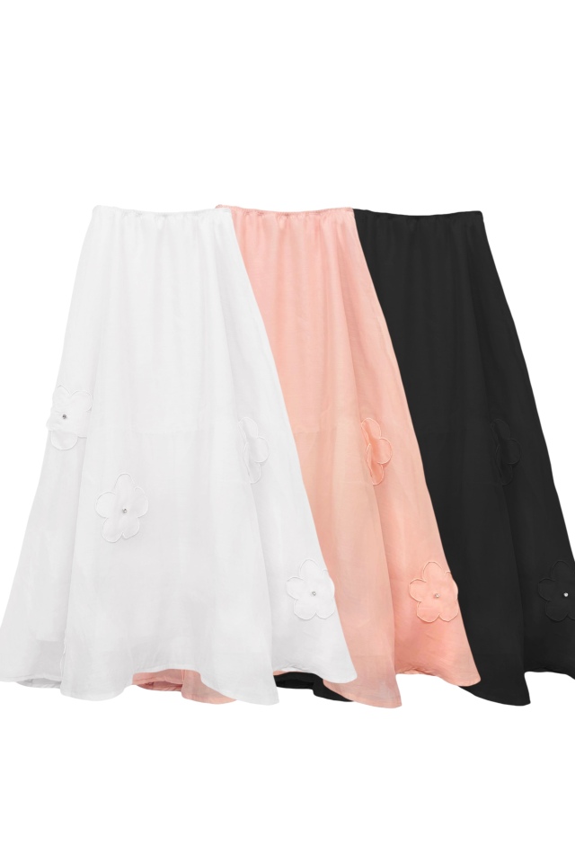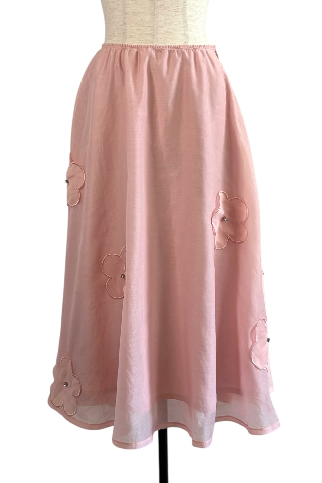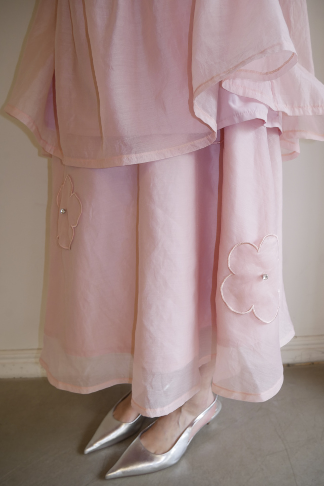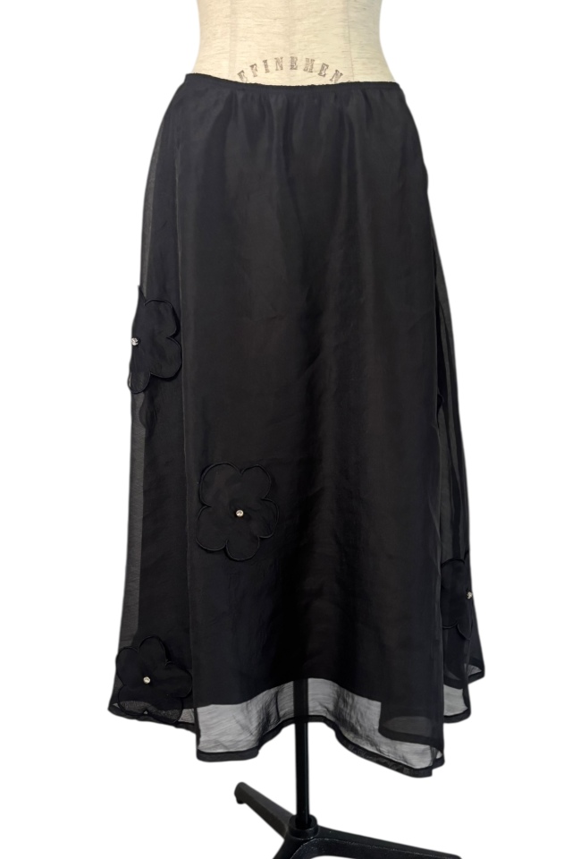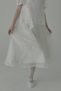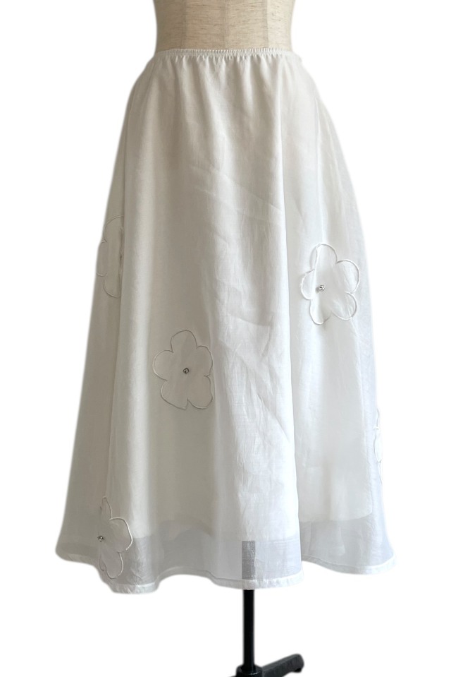 軽やかなオーガンジーにフラワーモチーフを散りばめた、フェミニンなロングスカート。