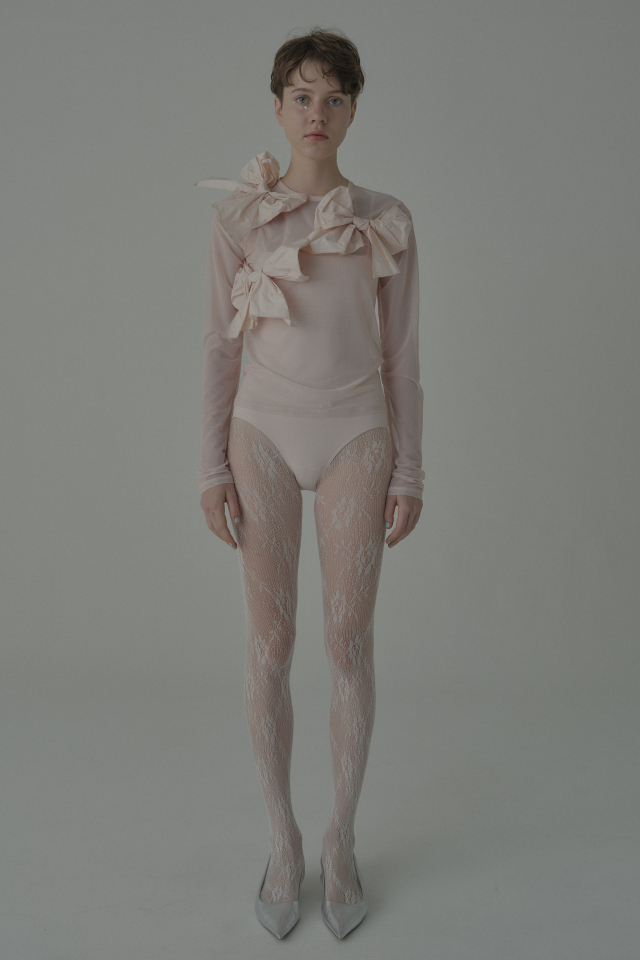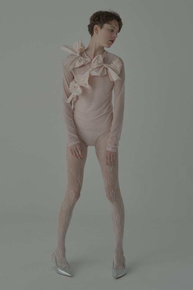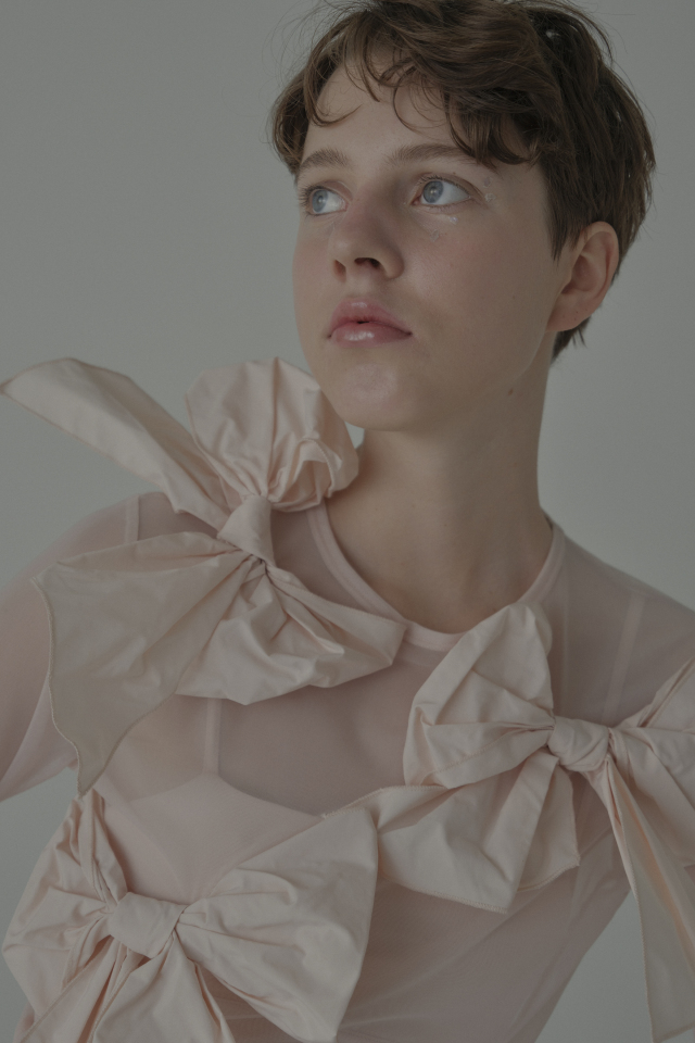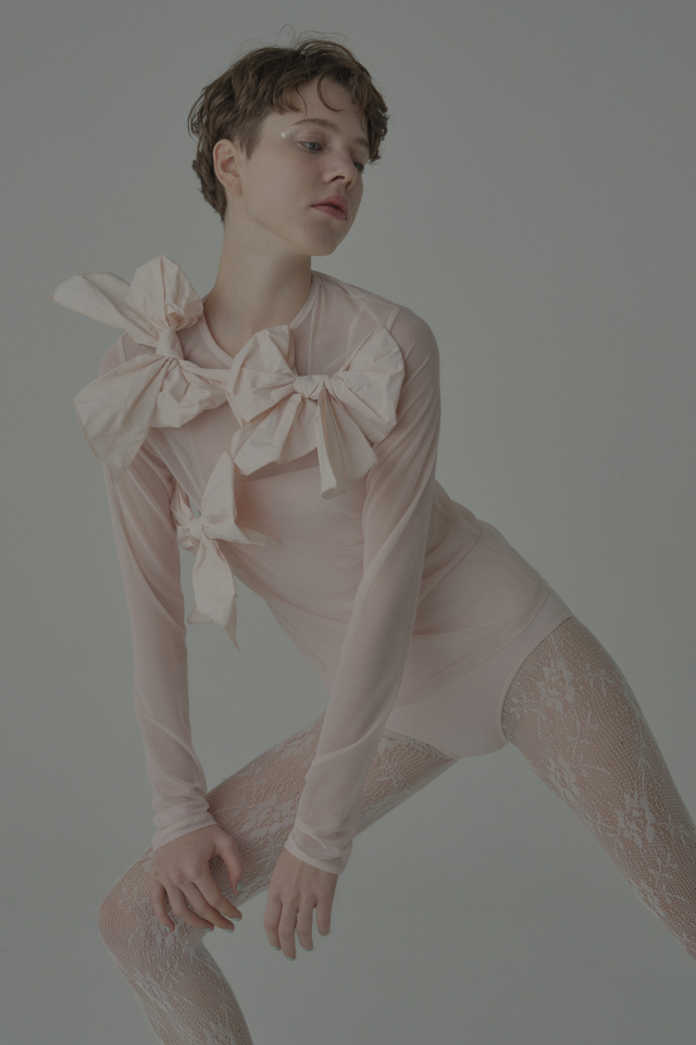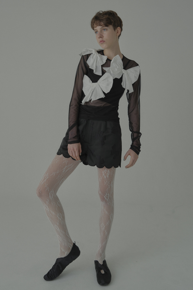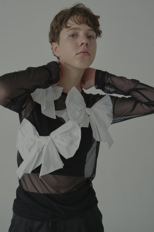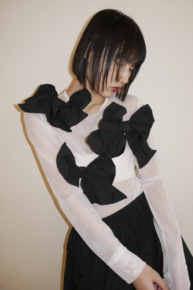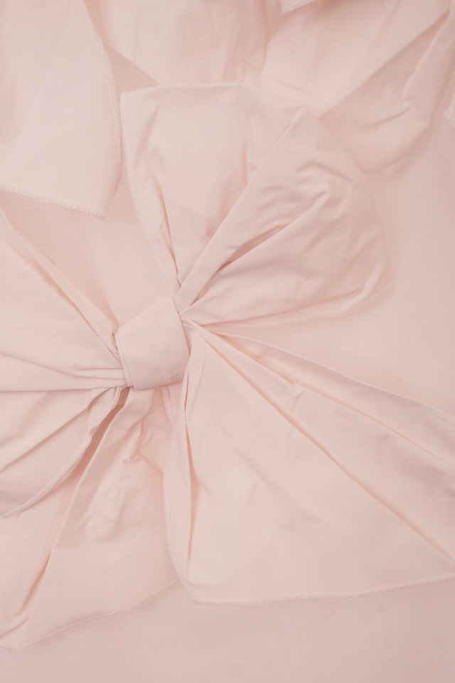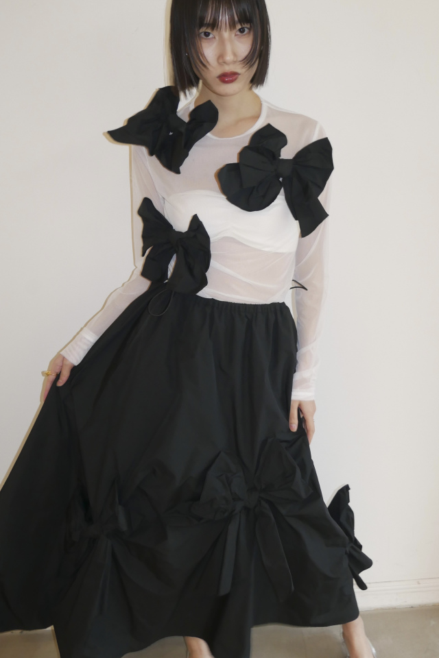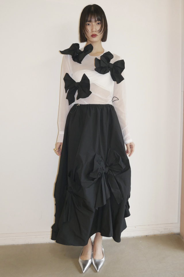 同シリーズの taffeta ribbon drape skirt(P26S1-DR-SK01) と合わせて、特別な日のためのドレスライクな装いに