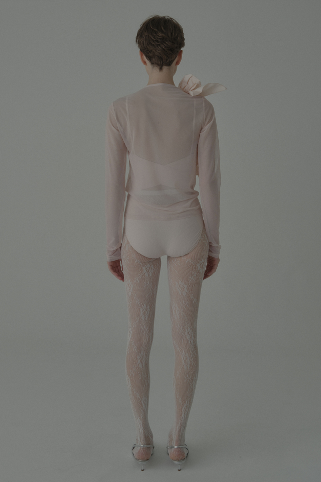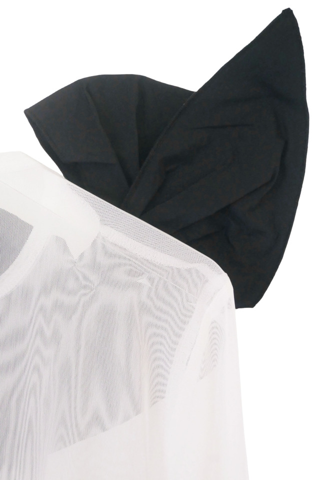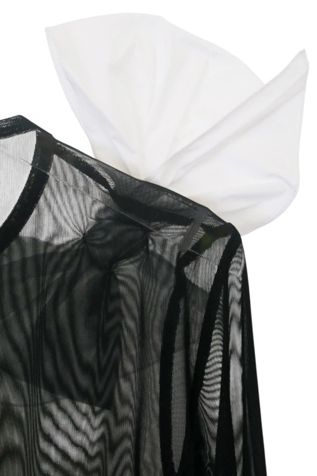 シアー素材の軽やかな透明感と、すっきりとしたシルエットが上品な一着。