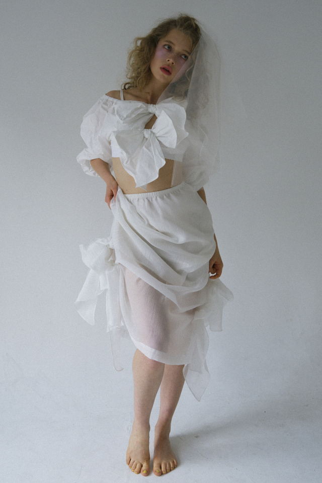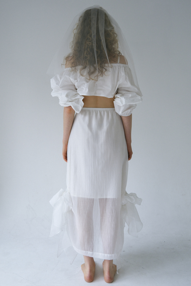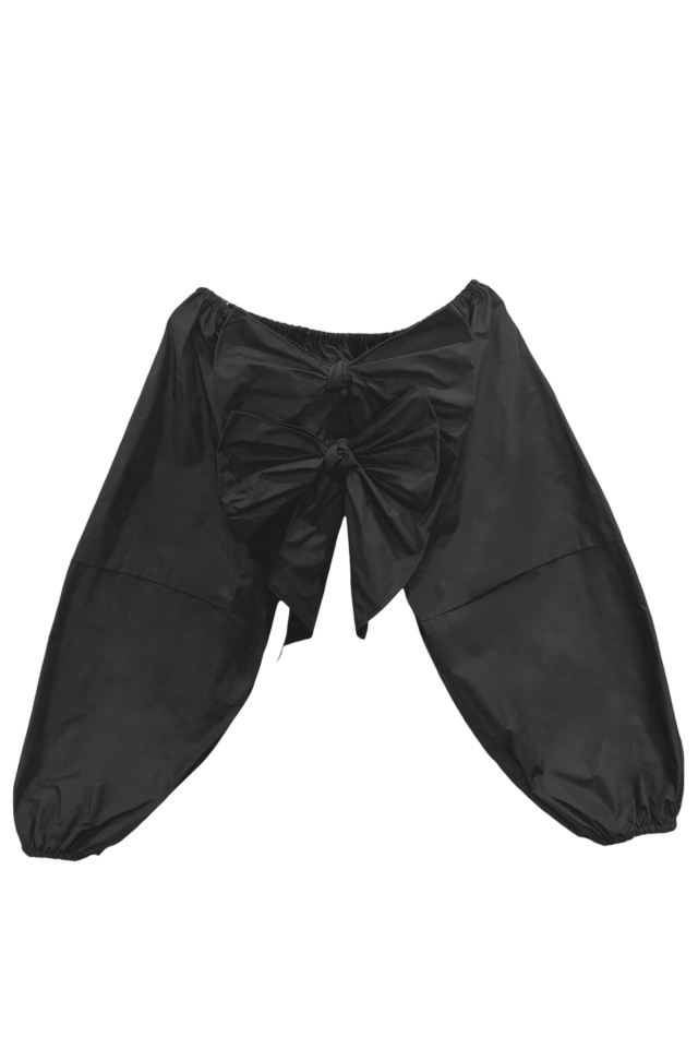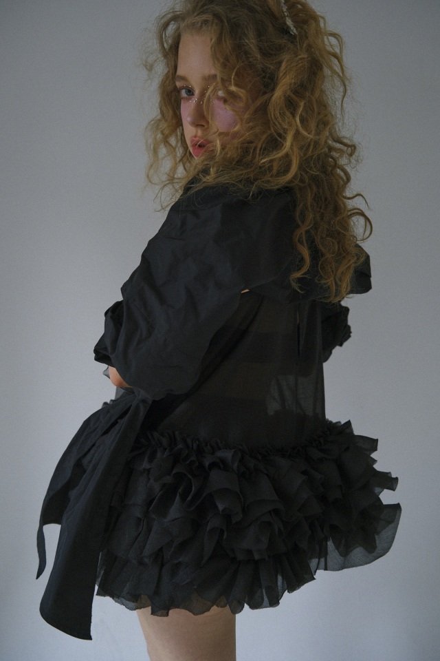 形状記憶タフタ特有のハリ感が立体的なフォルムを美しくキープし、前後2WAYで着用可能。